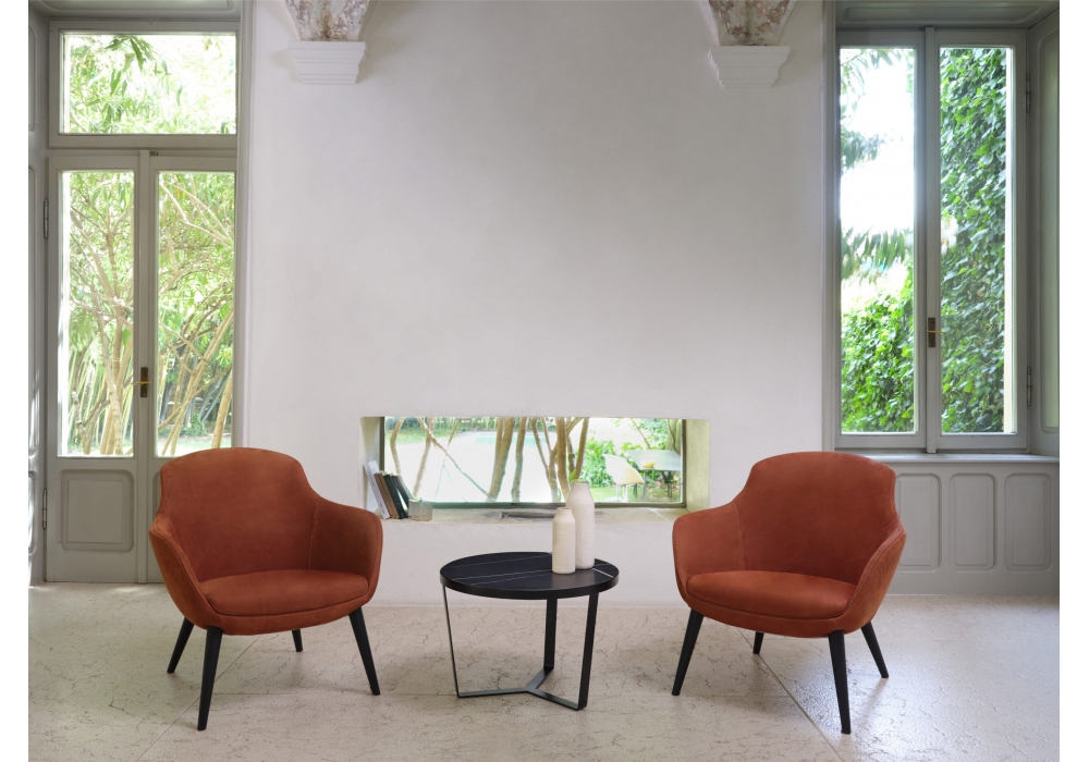 Karl designed by Joe Garzone for Conte Casa is an armchair with painted solid wood feet made with fabric or leather upholstery.
