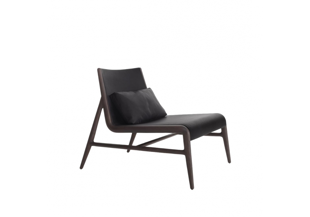 Sinua designed by Giuseppe Bavuso for Rimadesio is an armchair with a wooden structure, padded central shell covered in fabric or leather, equipped with a lumbar cushion included and an internal strap system. Available in different finishes.