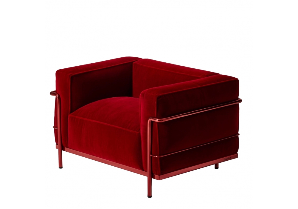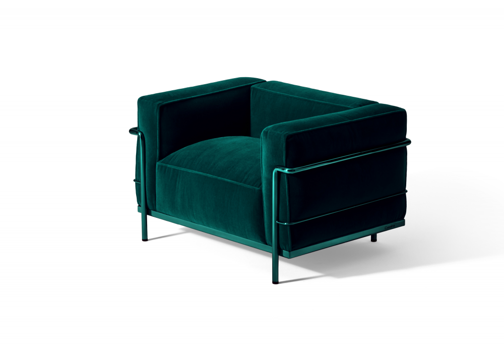 3 Fauteuil Grand Confort, Grand Modèle, Durable, 60 designed by Le Corbusier, Pierre Jeanneret, Charlotte Perriand for Cassina is an armchair upholstered in Lirico velvet and with a shiny metal structure.