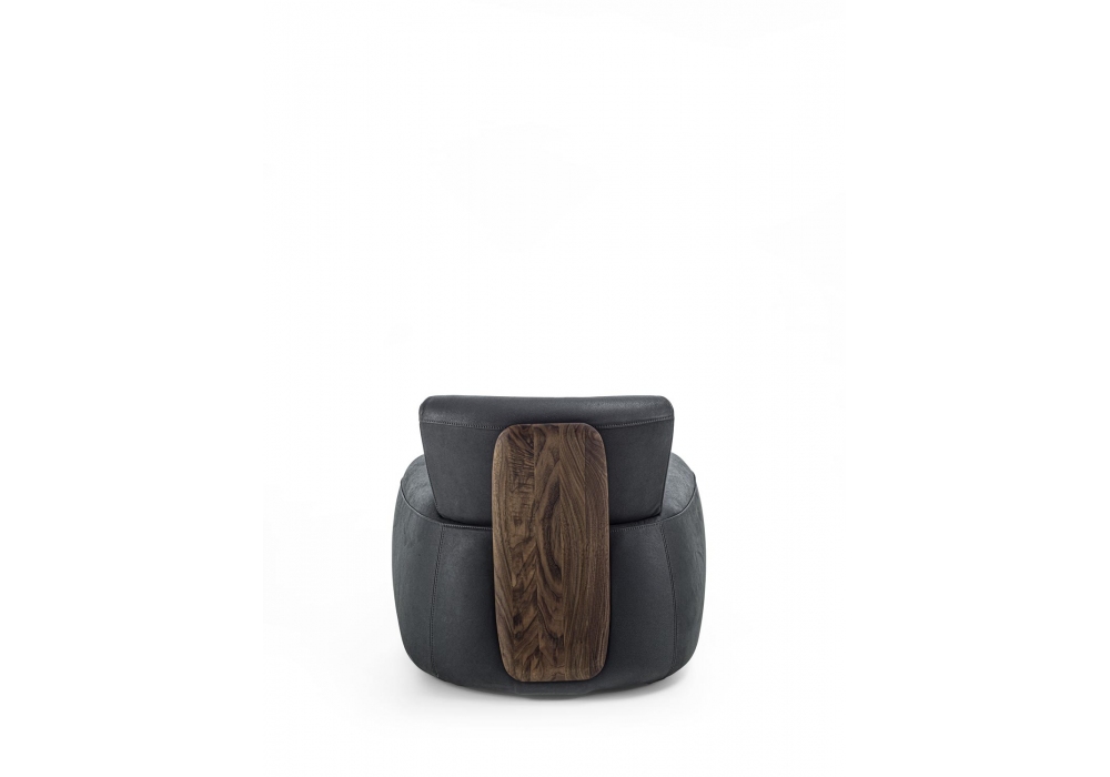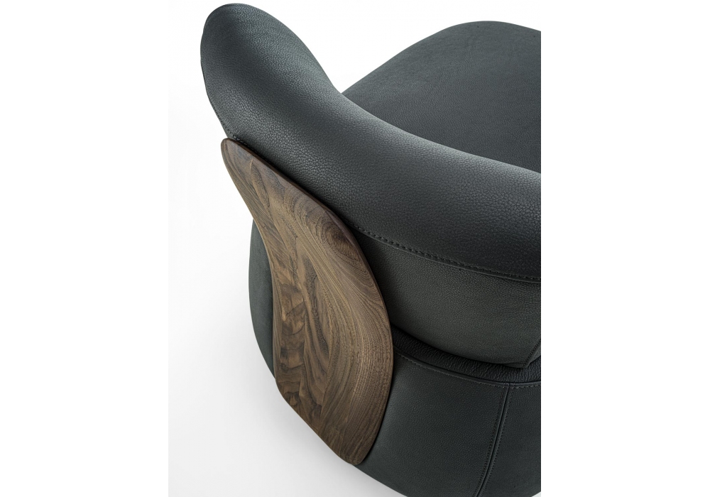 Passo designed by Ronald Sasson for Riva 1920 is a padded armchair covered in fabric or leather that features a solid wood backrest. Available in different finishes.