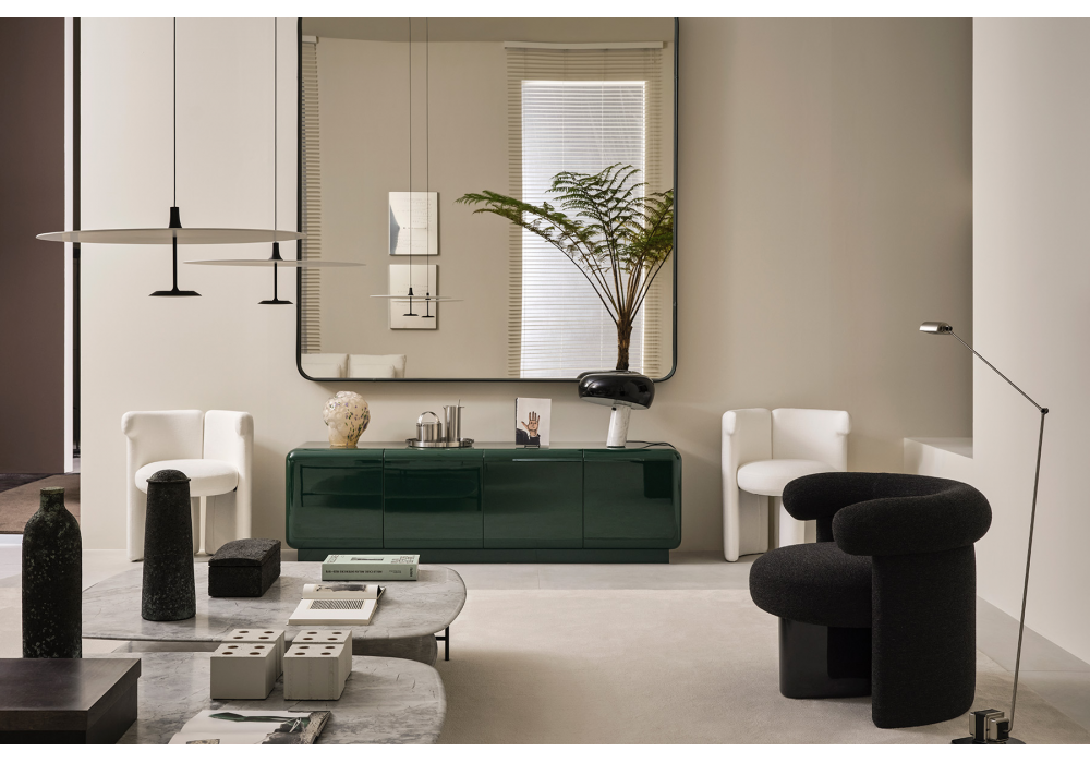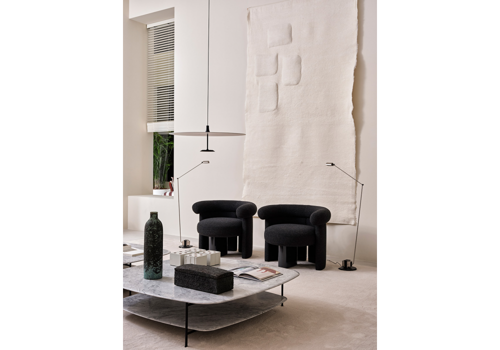 Jeanette designed by Andrea Parisio for Meridiani is an armchair with a central wooden leg in black stained beech or glossy or matt lacquer. Upholstery in different fabrics.
