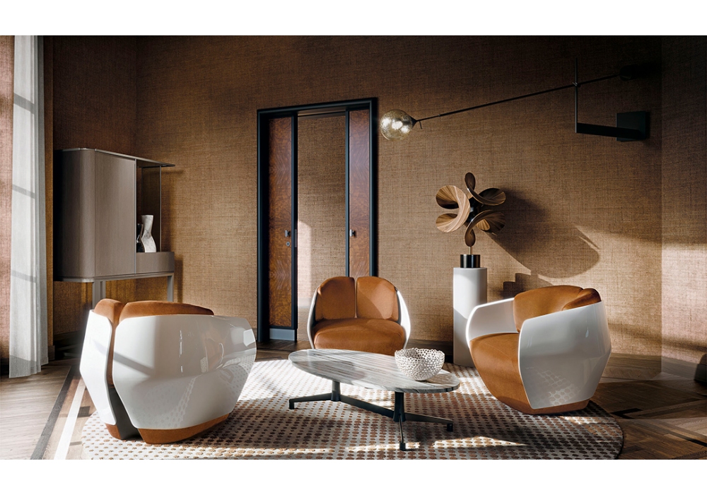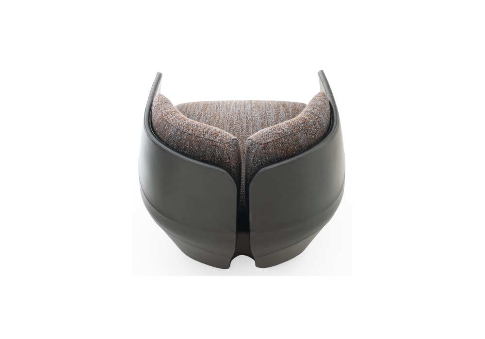 Lorelei designed by Giorgetti R&D is an armchair with two rigid polyurethane shells upholstered entirely in leather, in which the dynamic and refined stitching is as much aesthetic as technical. There is a also a perimeter insert and an insert on the back of the seat made of leather.