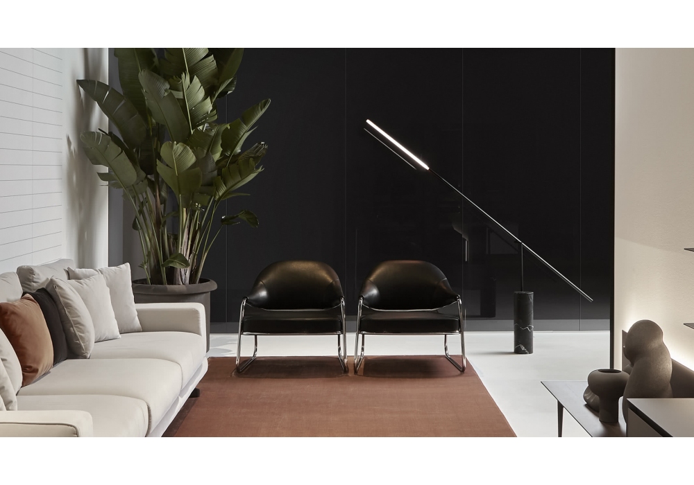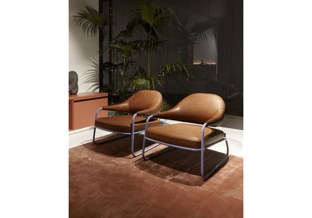 Lolla designed by Carlo Colombo for Antonio Lupi is an armchair with a polished chrome-plated or painted metal frame. The seat frame is made of plywood, polyurethane foam of varying densities, and a resin-coated backrest. The backrest is padded with polymex, wood, and metal, padded with various densities of foam, and lined with synthetic leather and velvet. Non-removable fabric or leather upholstery.