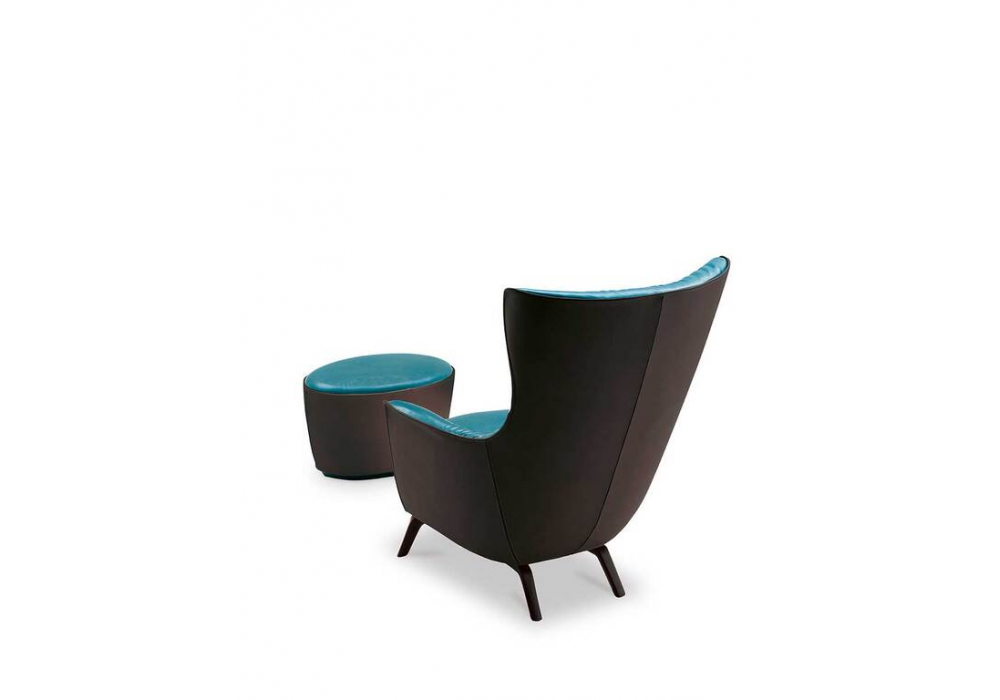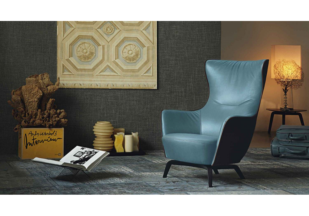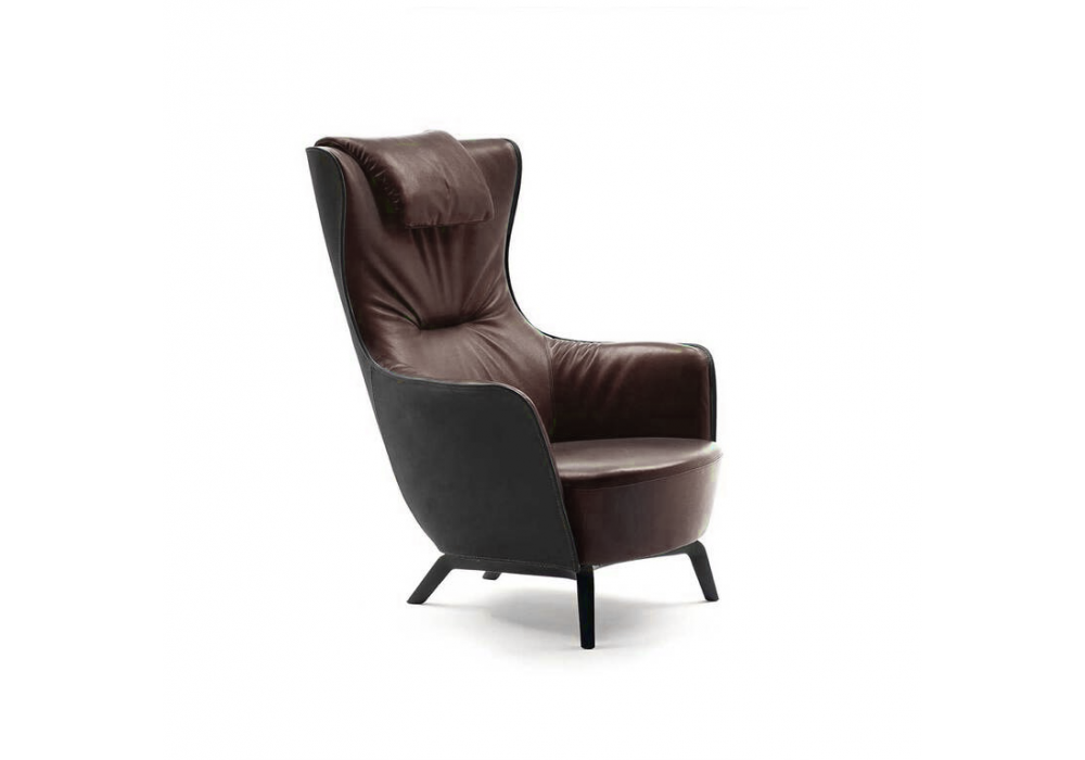 Mamy Blue, designed by Roberto Lazzeroni for Poltrona Frau, is an armchair with four-feet base, made of solid ash available in two finishes with an anchor plate fixing it to the shell in black varnished steel. Available in Fully upholstered in Pelle Frau® leather (also in a two-color version) or in a combination of two materials. the combination of the materials is exalted by the elegant visible stitching. Optional headrest not included in the price.