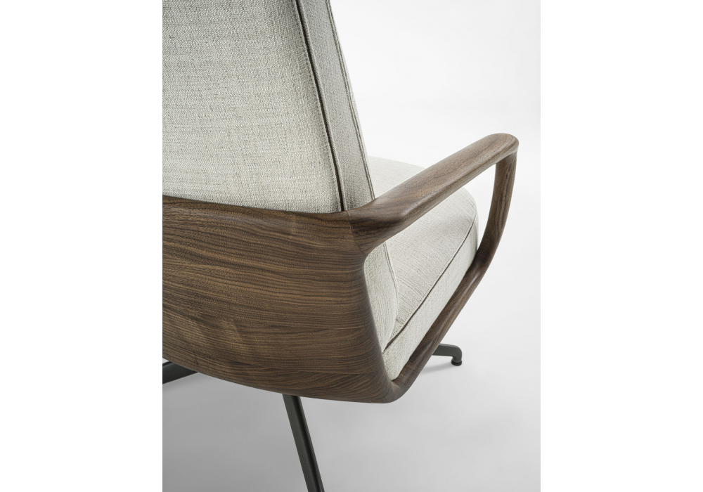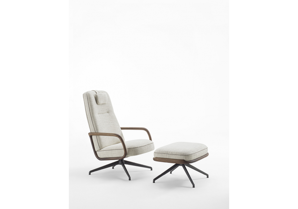 Cuna Lounge High designed by Emmanuel Gallina for Porada is a high-backed armchair with a swivel metal base and return mechanism. The internal structure of the backrest and seat is made of plywood, while the external upholstery is available in fabrics from the collection, with a negative piping stitched between the two seams. The external shell is made of solid Canaletta walnut with integrated armrests. The removable headrest, available in fabric, has a solid Canaletta walnut counterweight. A Cuna Lounge ottoman can be added.