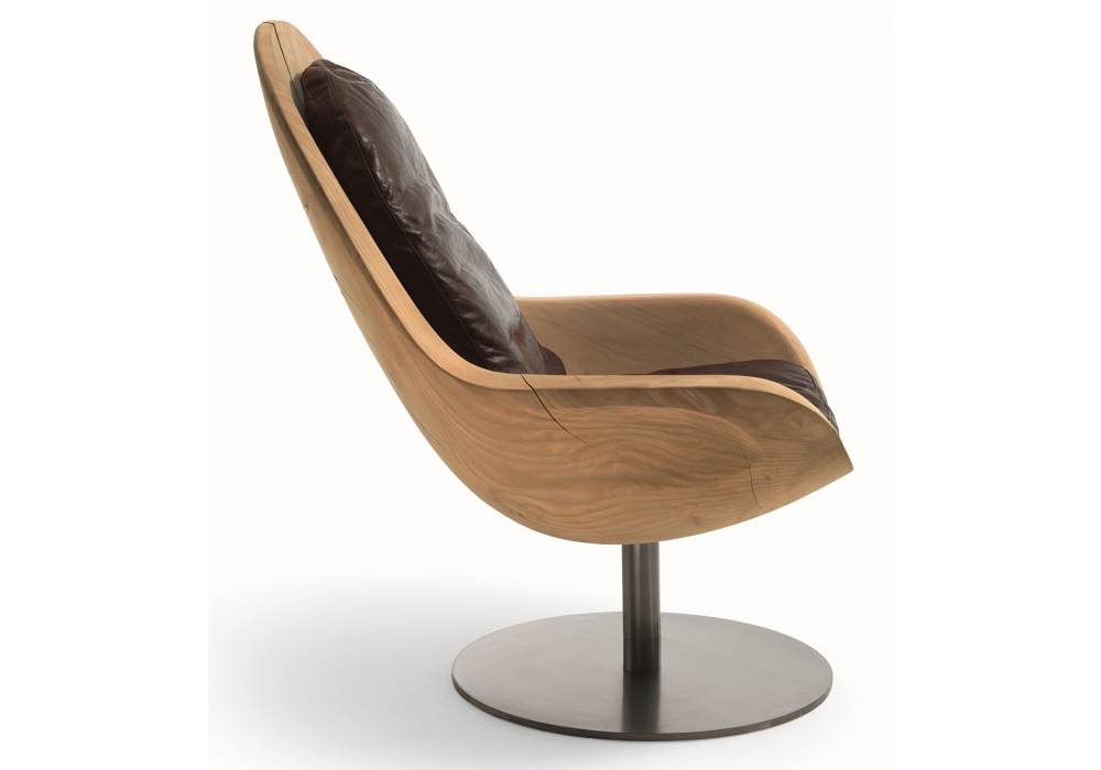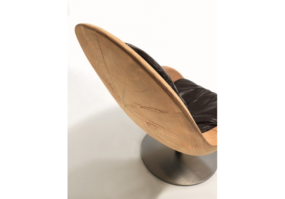 Creus designed by Pininfarina for Riva 1920 is an armchair in solid scented cedar worked from a single block, characterized by the enveloping and ergonomic shell in a continuous line between seat and back. Support cushion in fabric or leather with visible stitching. Base with tubular leg and iron plate.