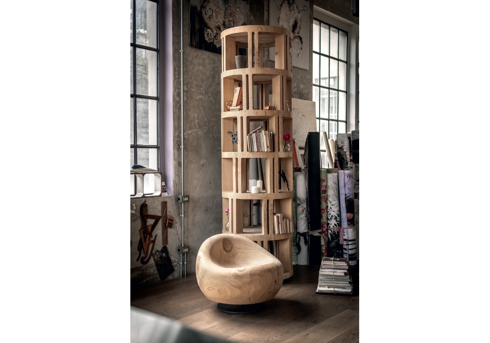 Maui designed by Terry Dwan for Riva 1920 is an armchair with swivel base with tubular leg and iron plate and shell in solid scented cedar worked from a single block.