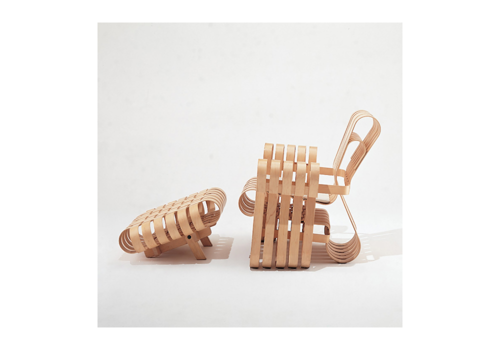 Power Play™ designed by Frank Gehry for Knoll is an armchair with footrest made of natural maple wood. Feet in transparent plastic with a matte finish. The backrest is made of preformed bands to reinforce the lumbar support.