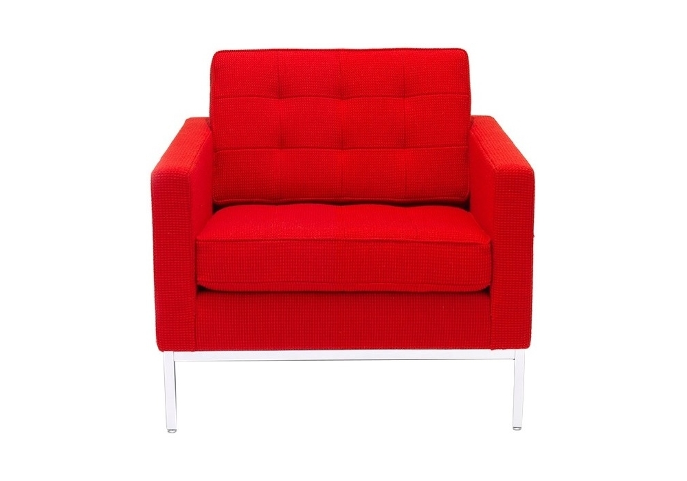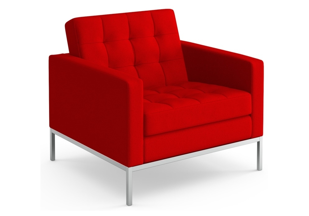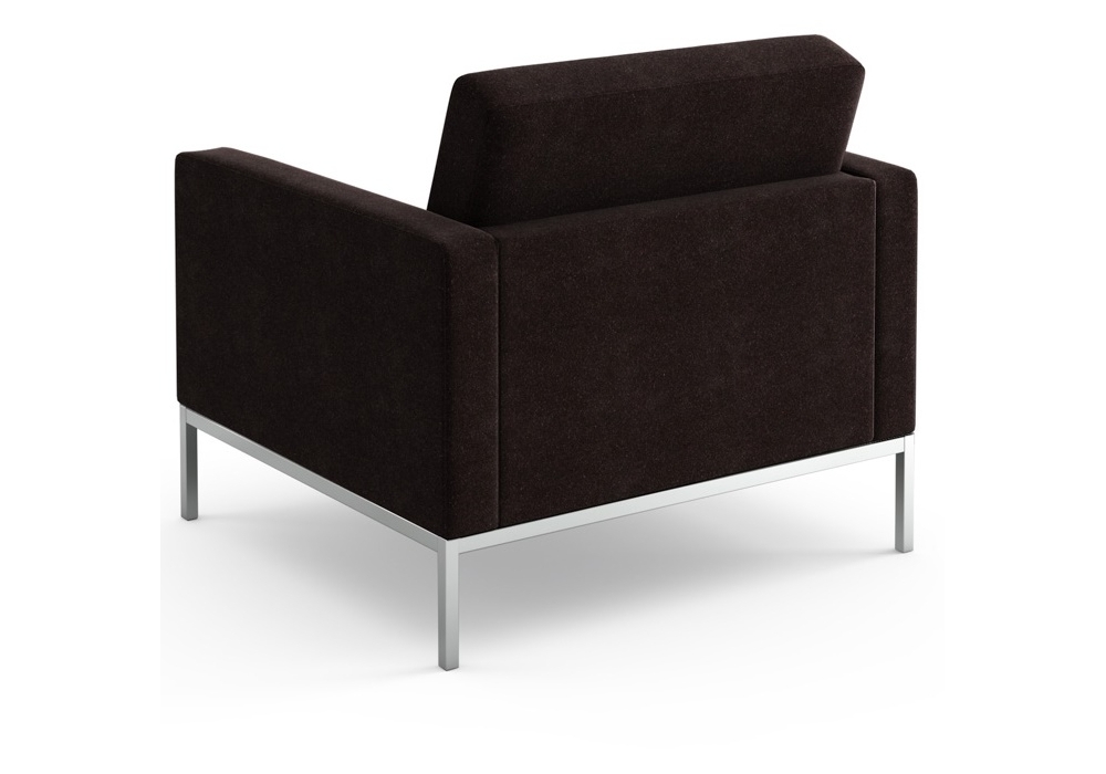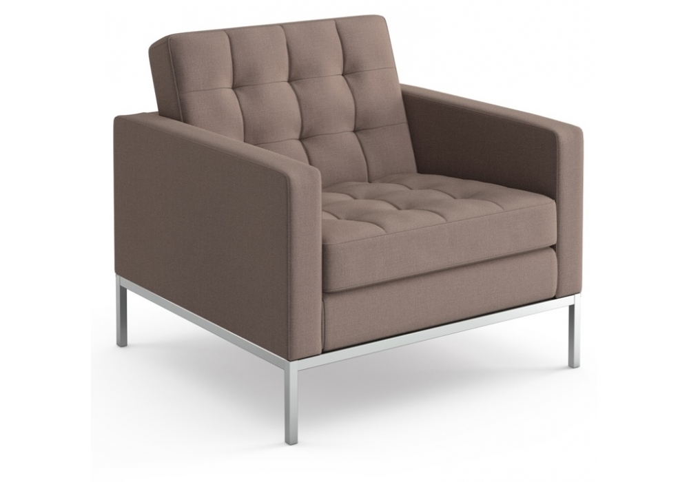Florence designed by Florence Knoll for Knoll is a lounge chair with a square section tubular steel frame with a polished chrome or painted finish. The seat and back cushions contain shaped foam in various densities and lined with polyester fibers to increase comfort. The cushions are quilted with box stitching. The seat and back cushions in leather have quilted squares with buttons while those in fabric have quilted squares without buttons. Upholstery in fabric or leather.