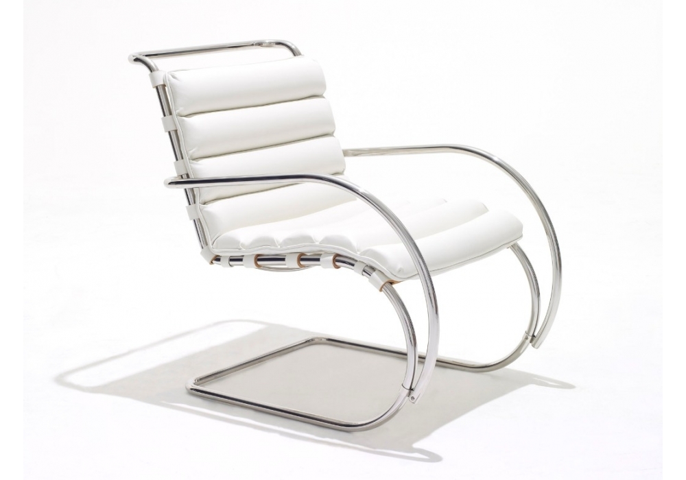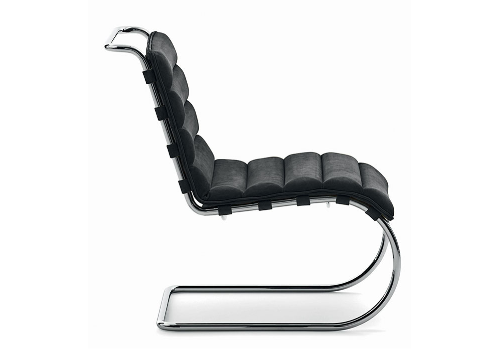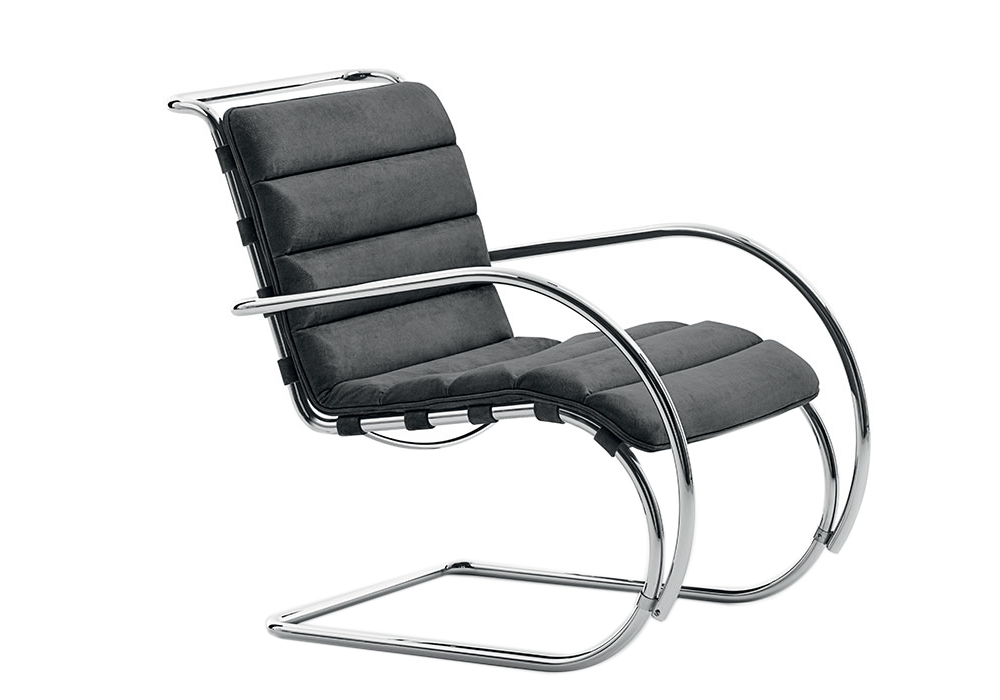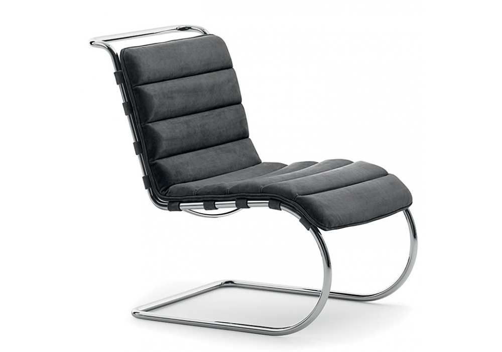 MR - Bauhaus 100th Anniversary Edition - designed by Ludwig Mies van der Rohe for Knoll is an armchair with or without armrests, with a structure made of polished chrome-plated tubular steel and thick leather cushion support straps. Cushion upholstery (removable) in fabric in various finishes.
