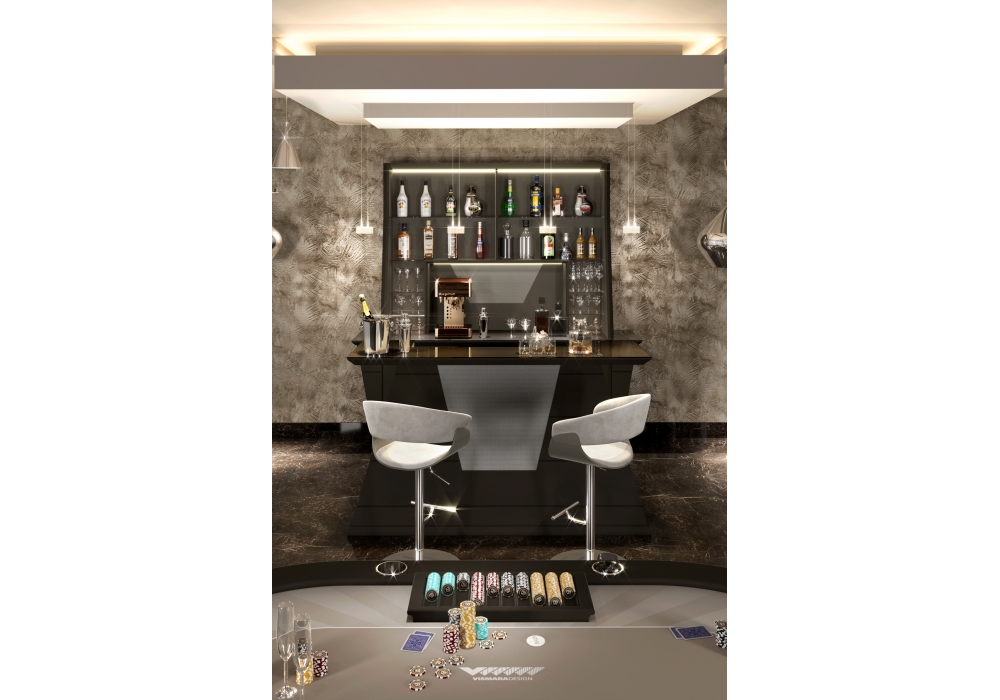 Hemingway bar designed by Vismara Design is a bar counter consisting of a wall unit and a counter. The wall unit is equipped with exposed tempered glass shelves with LED lights, the lower part with two compartments with steel doors and handles, built-in wine cellar for 29 bottles. The front counter features a lacquered tempered glass top, internal space with exposed shelves and a work space.