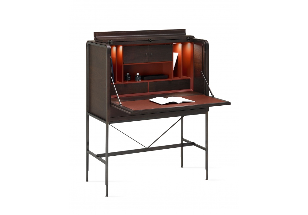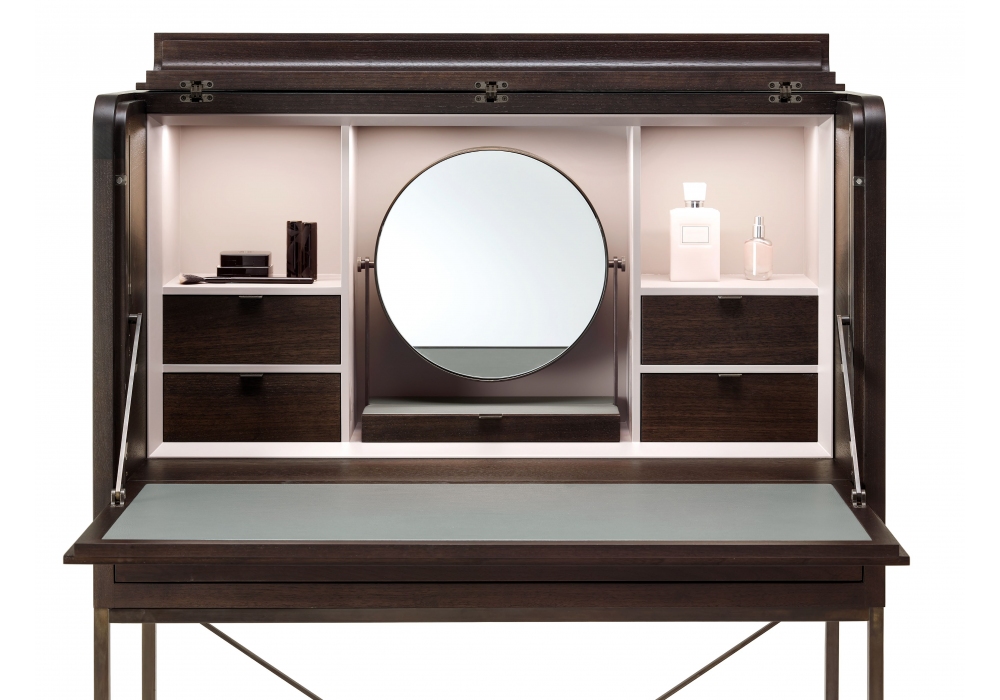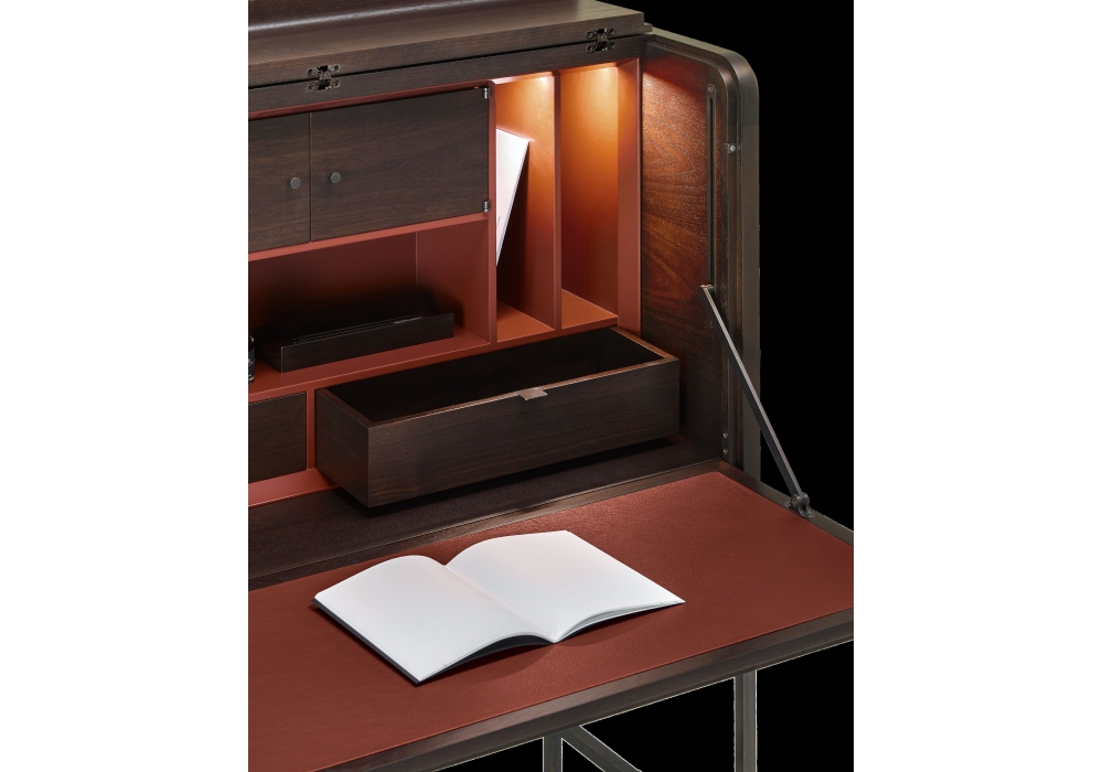 Scrinium designed by Giuseppe Casarosa for Ceccotti Collezioni is a cabinet available in three different versions: bar cabinet, desk or cabinet. The solid brass structure is embedded in the profile of the American walnut furniture body. The interior has been designed carefully and with attention to detail, and features a practical LED light. The fold-down door is covered in leather as is the bottom of the drawer (with push-pull opening) located below and featuring a different divider depending on the type of secretaire.