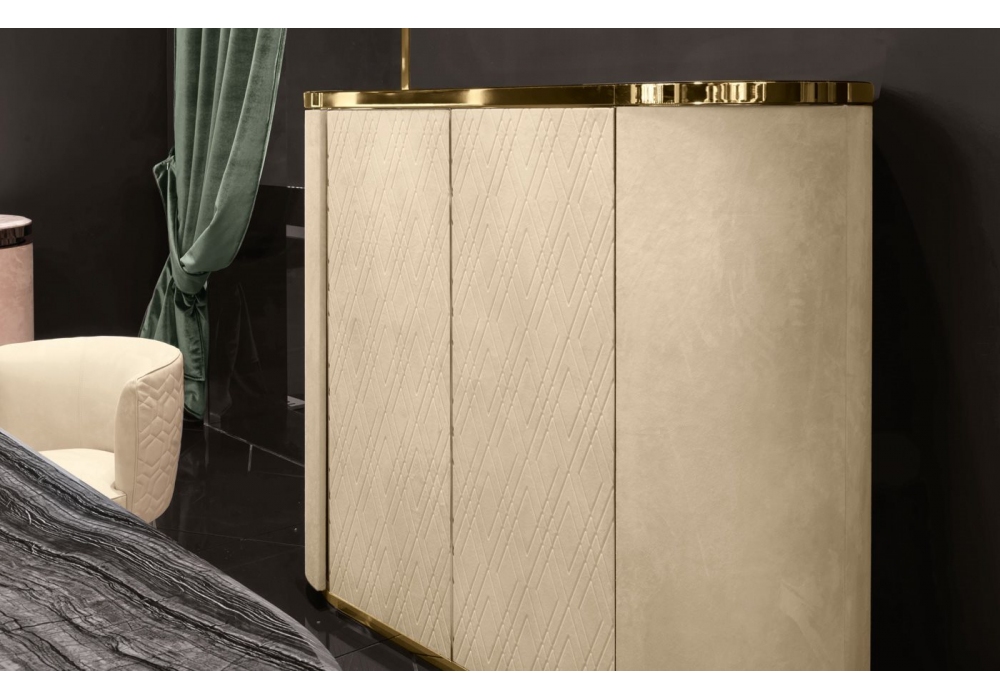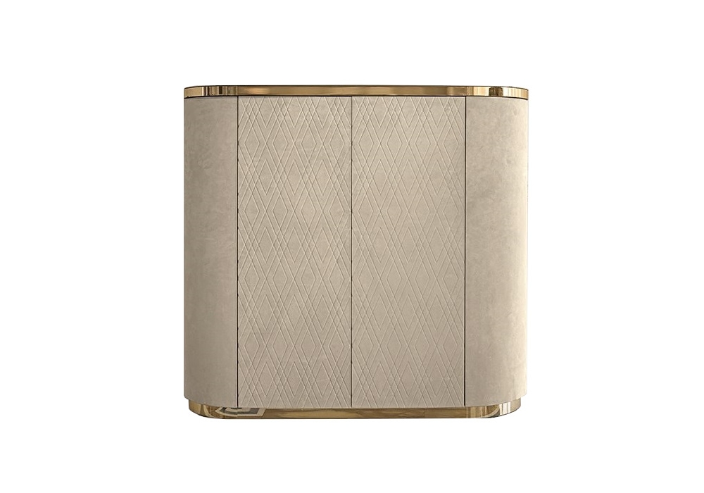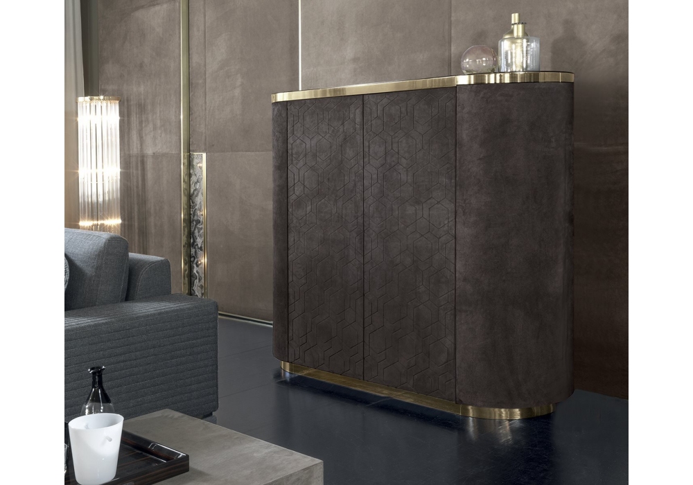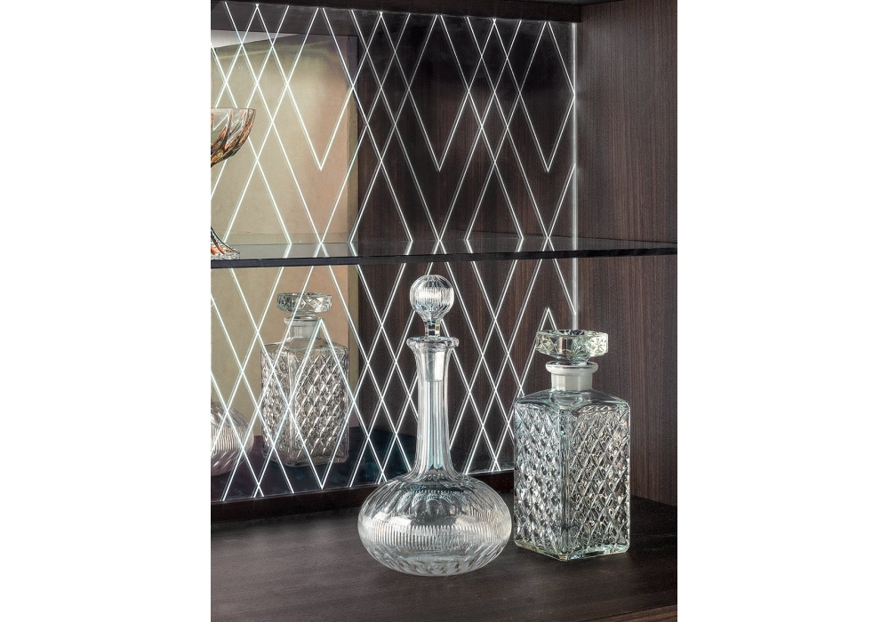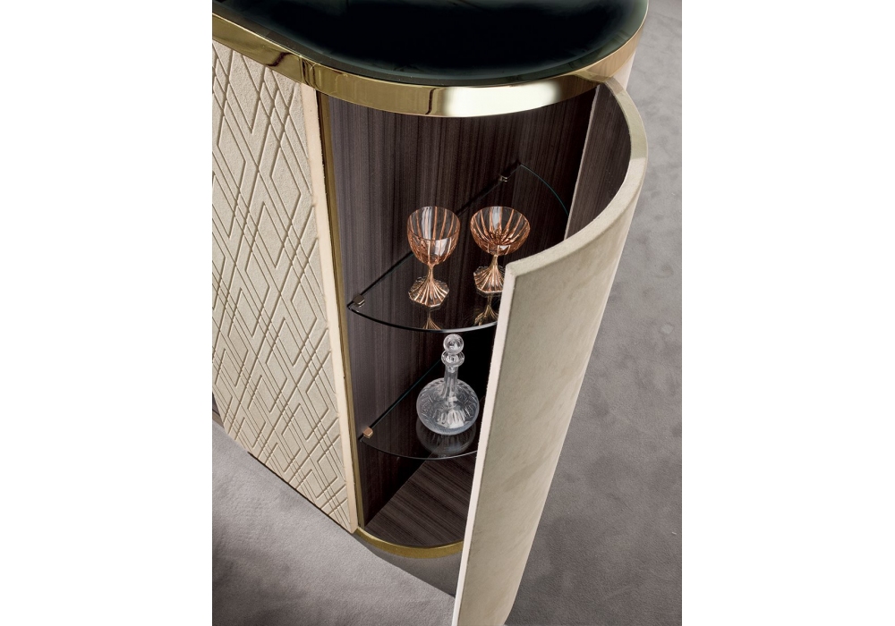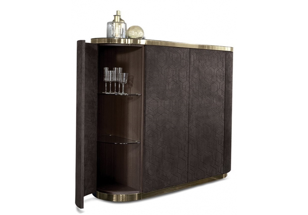 Beverly designed by Giuseppe Iasparra for Longhi is a bar cabinet upholstered in leather or cashmere. Internal finish in dark stained zebrano wood, transparent glass shelves and two drawers. Mirror top and ground metal base and edges. As an accessory, a mini wine cooler can be added. Available in the version with smooth covering or with Sequence or Diamond relief decoration. On request it is possible to add a cold light LED lasered mirror.