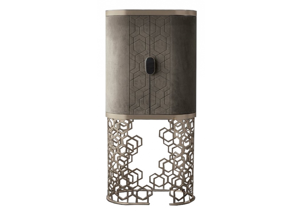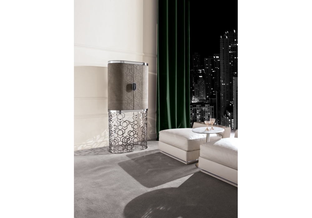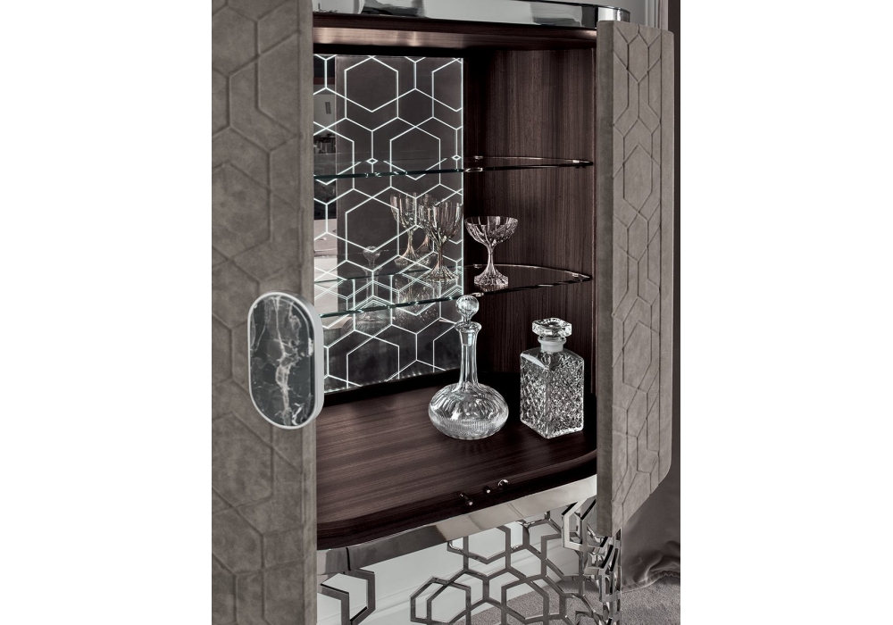 Mini Beverly designed by Giuseppe Iasparra for Longhi is a bar cabinet upholstered in leather or cashmere. Dark stained zebrano wood internal finish, transparent glass shelves and cold light LED lasered mirror. Mirror top and laser-cut ground metal base with Sequence motif. Available in the version with smooth covering or with Sequence or Diamond relief decoration.