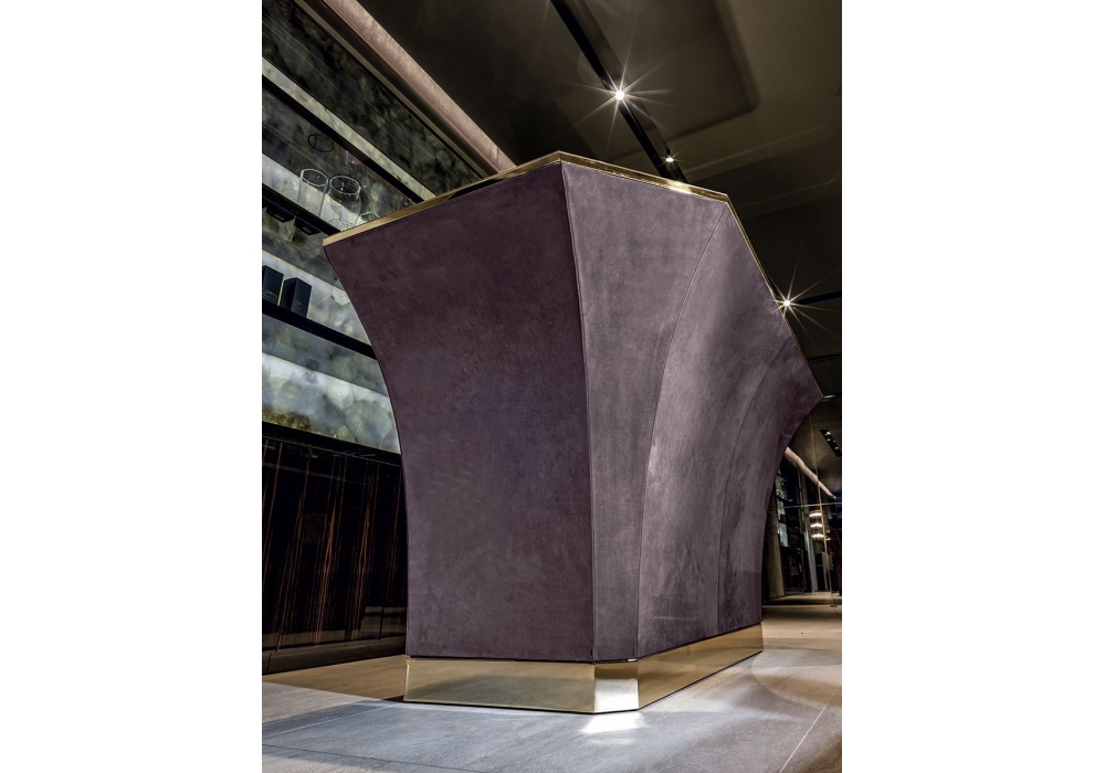 Grandelon designed by Kazemekas for Longhi is a bar cabinet with lower edge and undertop in ground metal, upper top in bronze or smoked mirror and service top in brushed steel. Structure covered in leather with the doors of the internal compartments in wood essence. Available in the version with or without tray with drain on the top. A wine cooler can be inserted as an accessory.