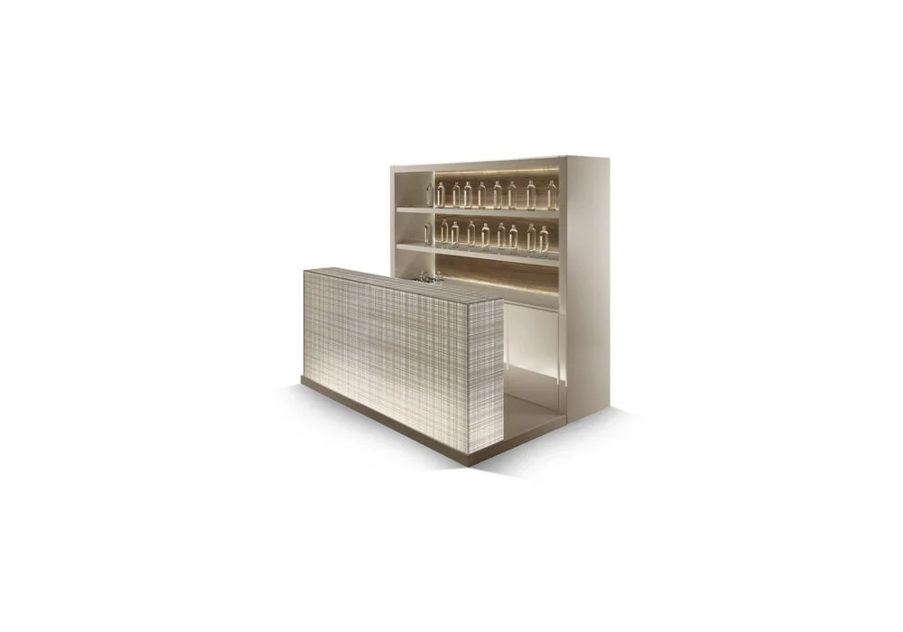 Avantgarde designed by Reflex Angelo is a bar unit composed by: wall unit as special version of Avantgarde bookcase in shiny lacquered wood with applications of beveled lacquered glass on the fronts and back in white lacquered glass, smoked mirror, Canaletto walnut or in Marble glass, with 2 long shelf and 4 doors; Bar counter with light in extraclear, bronze or smoke with frosted and bush-hammered finish or in glass with Vienna pattern design; platform in shiny finish matching the bookcase. Optional cooled nottle holder and Led lighting on the shelves.