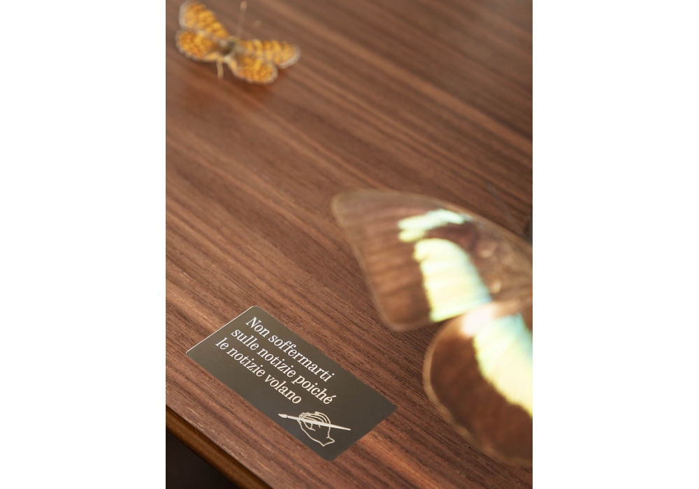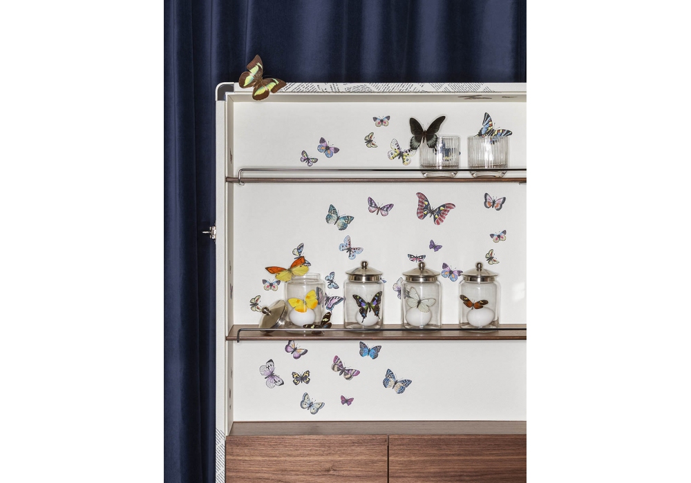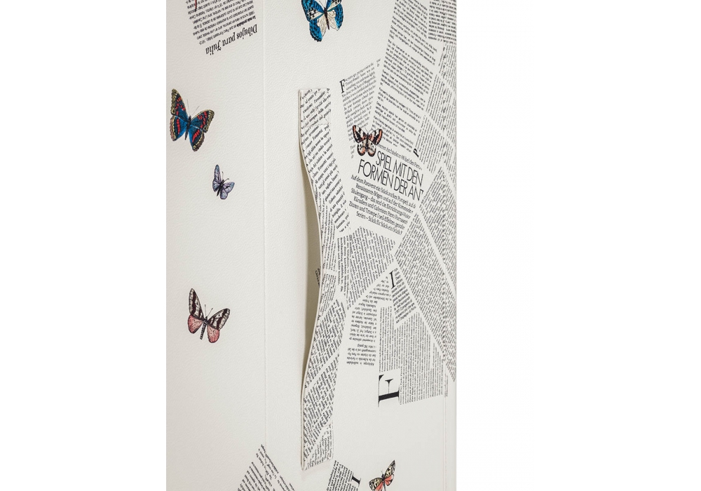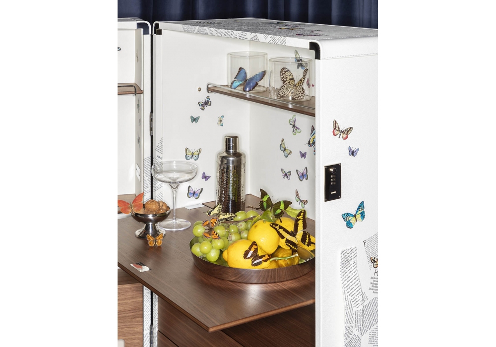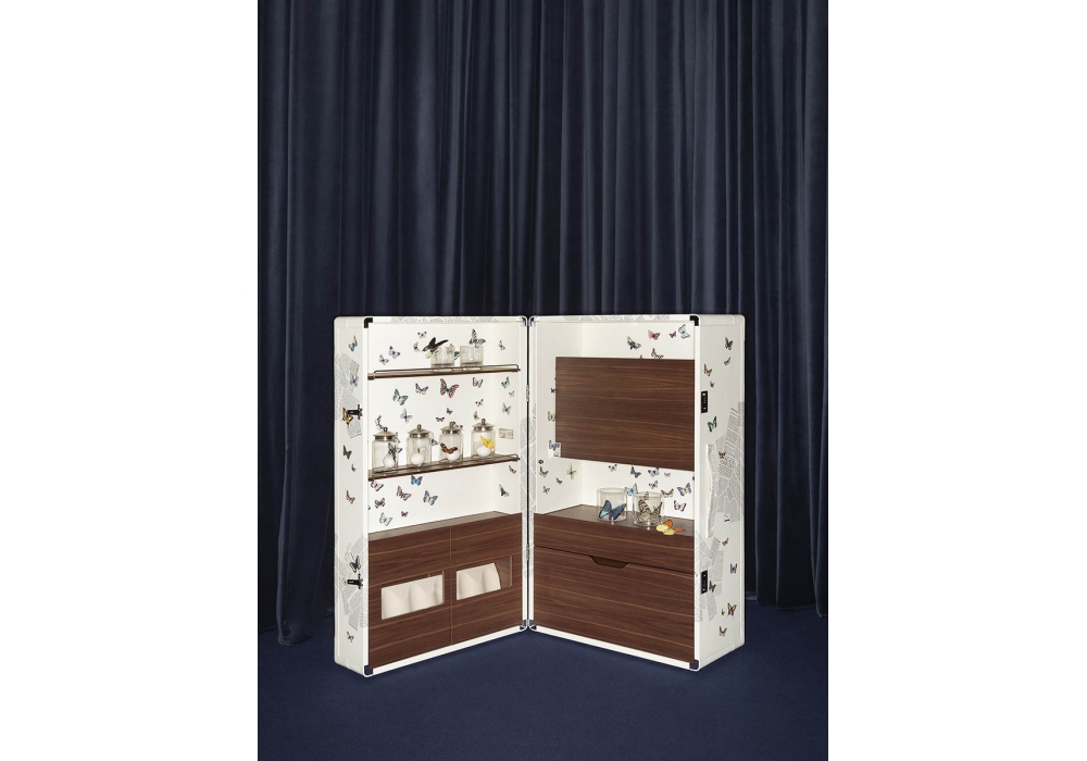 Isidoro Ultime Notizie designed by Jean-Marie Massaud for Poltrona Frau is a trunk-bar created in collaboration with Fornasetti, it is an example of contemporary luxury signed Poltrona Frau. Made of wood, completely by hand, it has refined Walnut-colored finishes, while the internal and external parts are covered in fine Pelle Frau® printed with one of the most characteristic patterns of the Fornasetti archive, the “Ultime notizie” decoration. The handle can be chromed or covered in leather. Shelves, drawers and bottle racks complete this extraordinary object of great visual impact and rediscovered modernity.