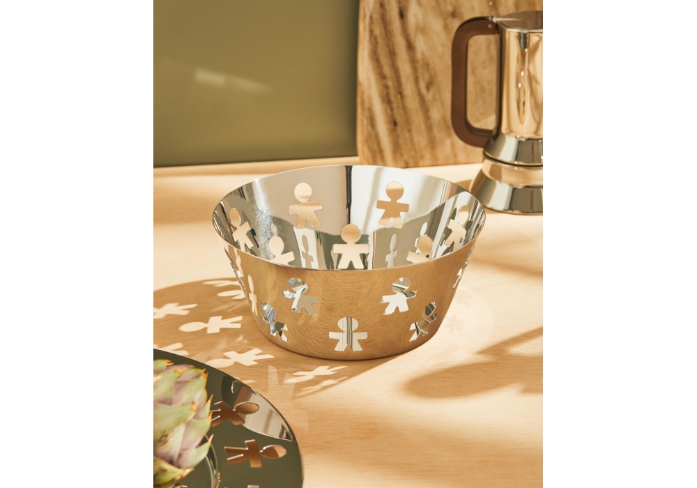Girotondo designed by King-Kong for Alessi is a open-work round basket made of steel available in two sizes.
