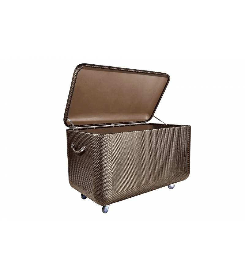 La Malle designed by Lorenza Bozzoli & The Kings for Dedon is a cushions trunk features pneumatic springs for the lid, easy-rolling wheels, breathable Tensiline® fabric for the interior and specially designed ventilation to keep it moisture-free. All trunks are designed for short-term storage of DEDON cushions and pillows. Ensure the cushions are completely dry before storing them in the trunk. The trunk can be used in covered outdoor areas as well as indoors.