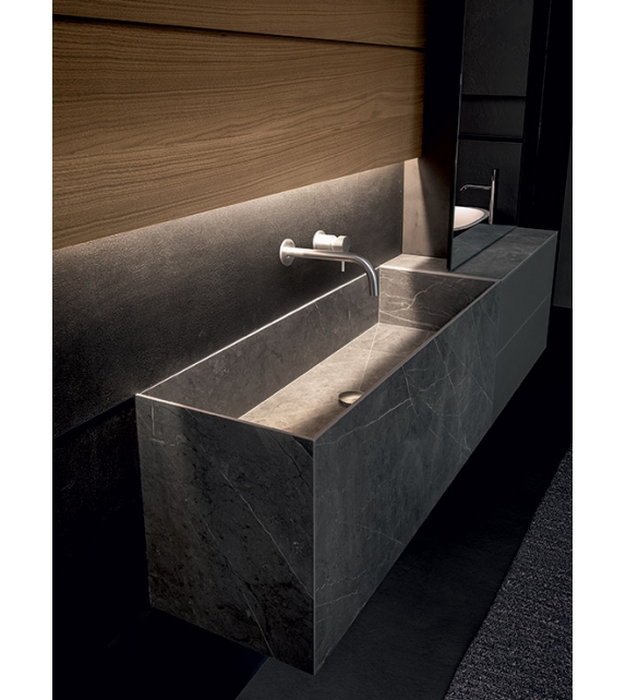 Blade designed and produced by Modulnova is a bathroom system with a large block on the ground with integrated sink, in Piasentina stone with ribbed processing. The system can become a home wellness space, with a mini swimming pool equipped with hydromassage, Airpool system and chromotherapy. The led shower head has different functions: tropical rain, energizing waterfall, nebulization. A large mirror hides a shelf column. Countertops, equipped wall and freestanding bathtub are accessories that enrich the system, with a very wide selection of different materials; contact our Customer Service to make it happen at your convenience.