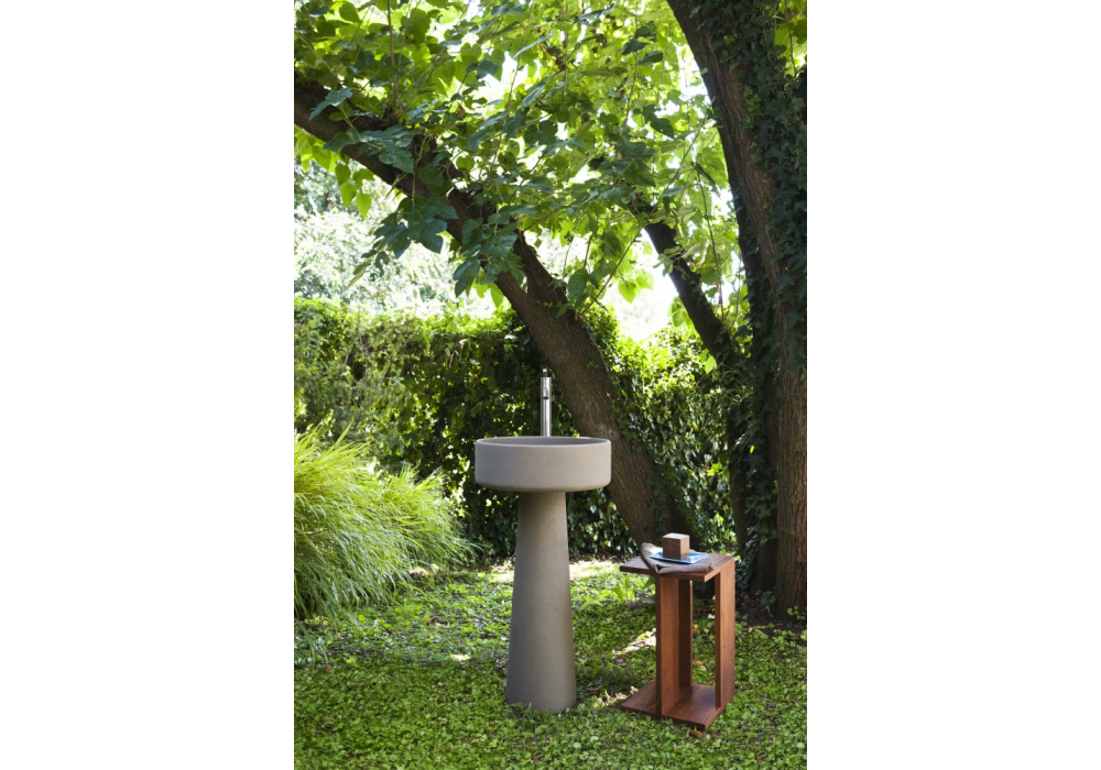 Bjhon 1 Outdoor designed by Angelo Mangiarotti for Agape is a column washbasin made of Petit Granit marble or Cementoskin® in different finishes. It is characterized by a cylindrical basin and floor support. There is no tap hole; free drain. Available in the version with wall or floor drain.