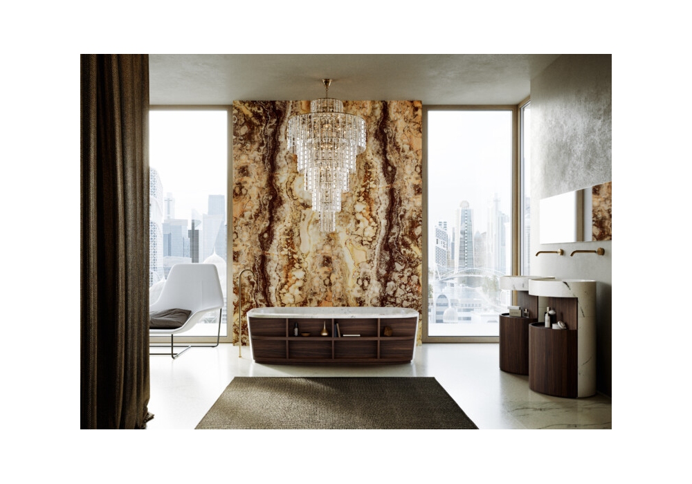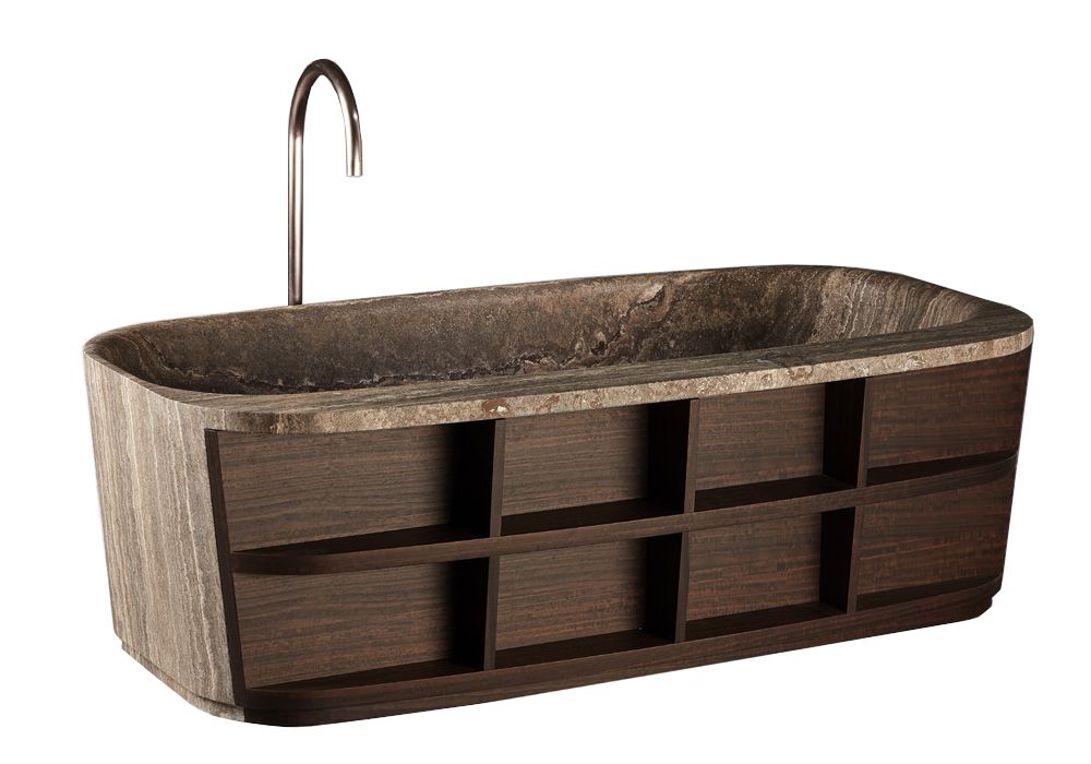 Hug designed by Matteo Nunziati for Kreoo is a bathtub made of marble with front part in essence wood with shelving on which to store your accessories or towels. Available in different finishes.