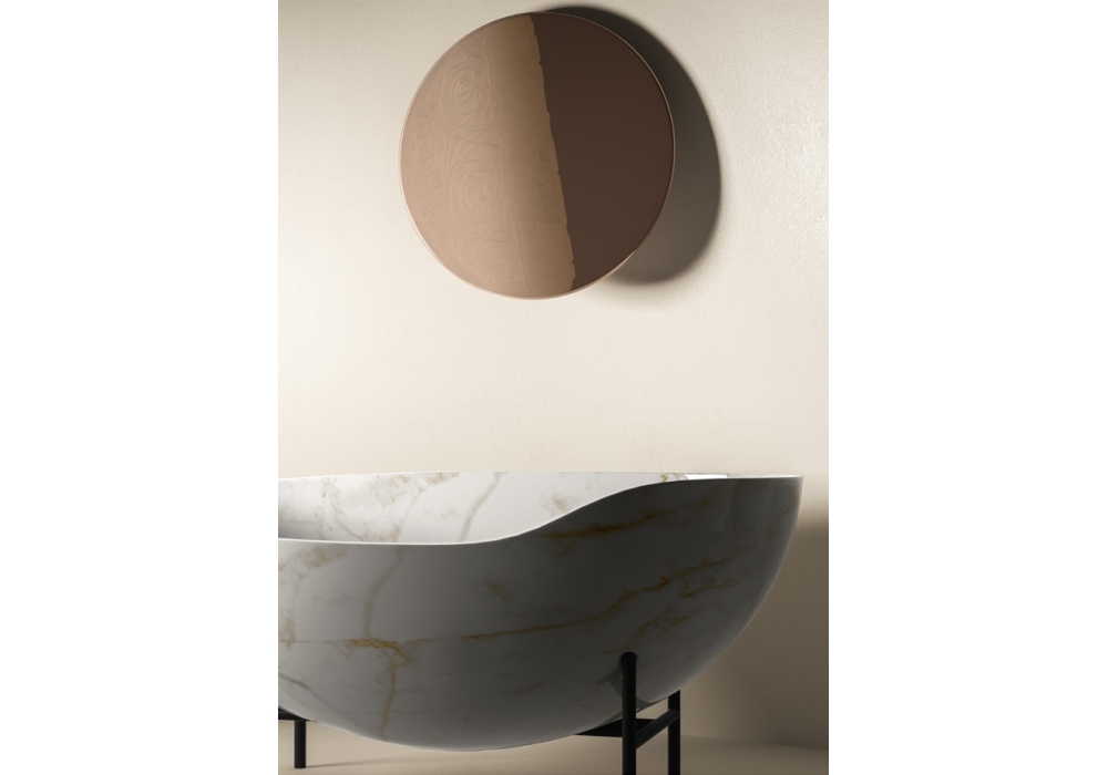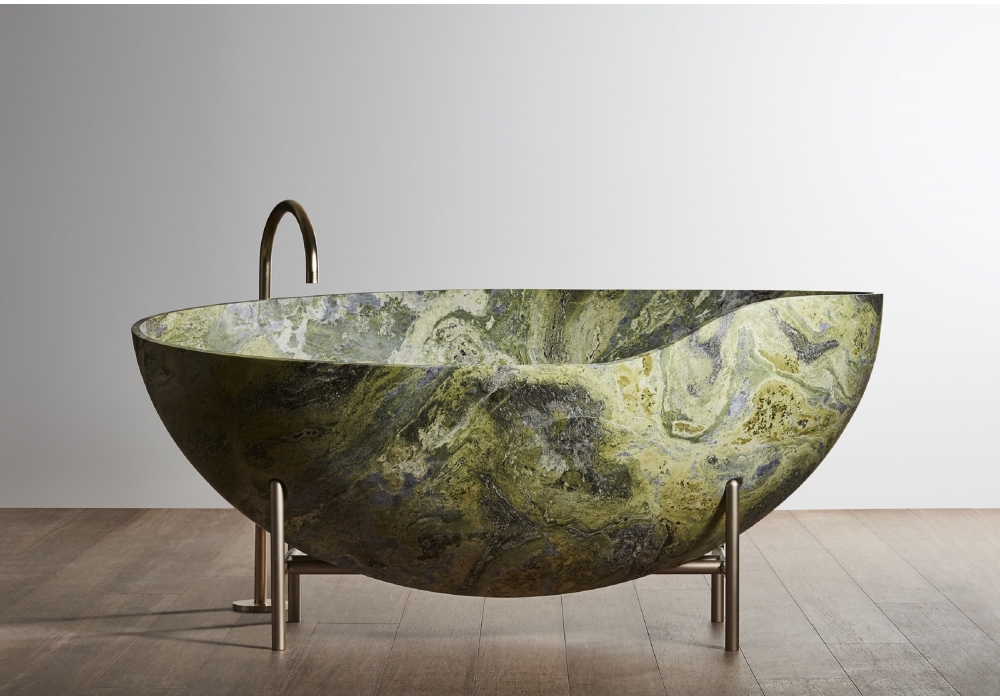 Kora designed by Enzo Berti for Kreoo is a freestanding bathtub made from a single block of marble carved at variable heights and metal legs.