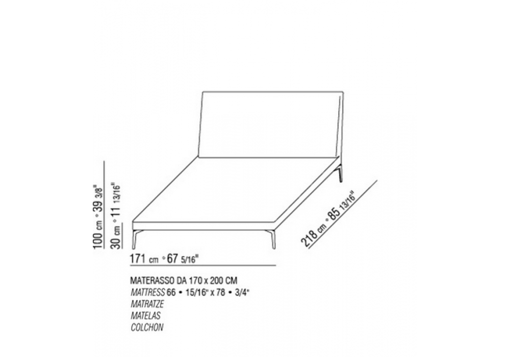 Feel Good Ten is a bed designed by Antonio Citterio for Flexform. Base: metal frame covered in fabric or leather. Head: wood with polyurethane padding covered with a protective fabric. Available with fabric or leather, with removable covers. Feet: metal. Mattress not included.