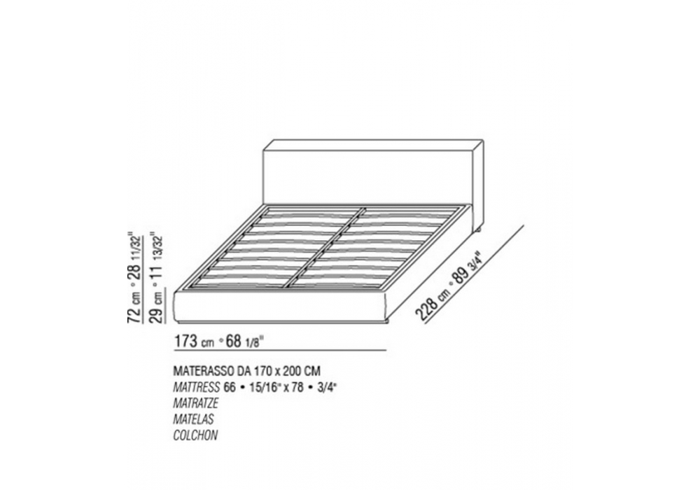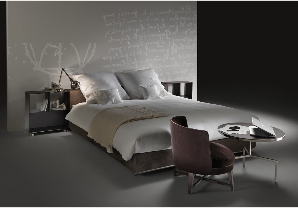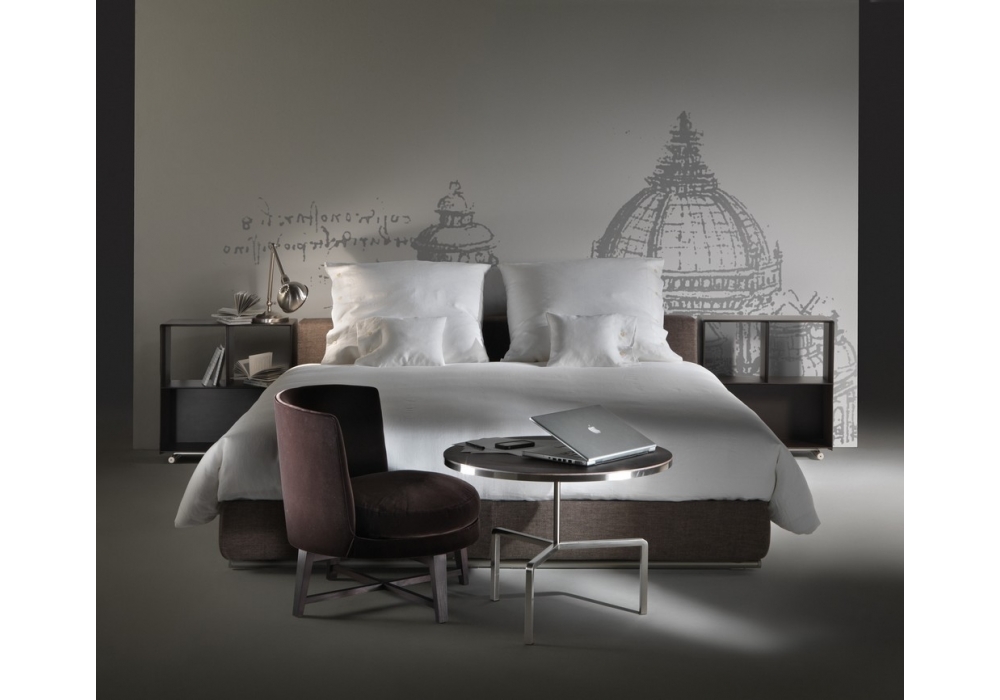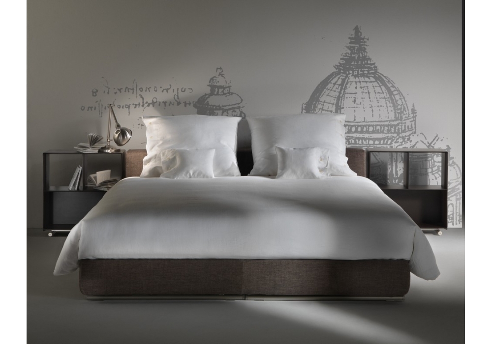 Groundpiece Slim is a bed designed by Antonio Citterio for Flexform. Base in wood with polyurethane padding covered with a protective fabric lining. Base with platform fitted with wooden slats. Headboard: in wood with polyurethane padding covered with a protective fabric lining. Feet: in metal treated with epoxy lacquer. Mattress not included.