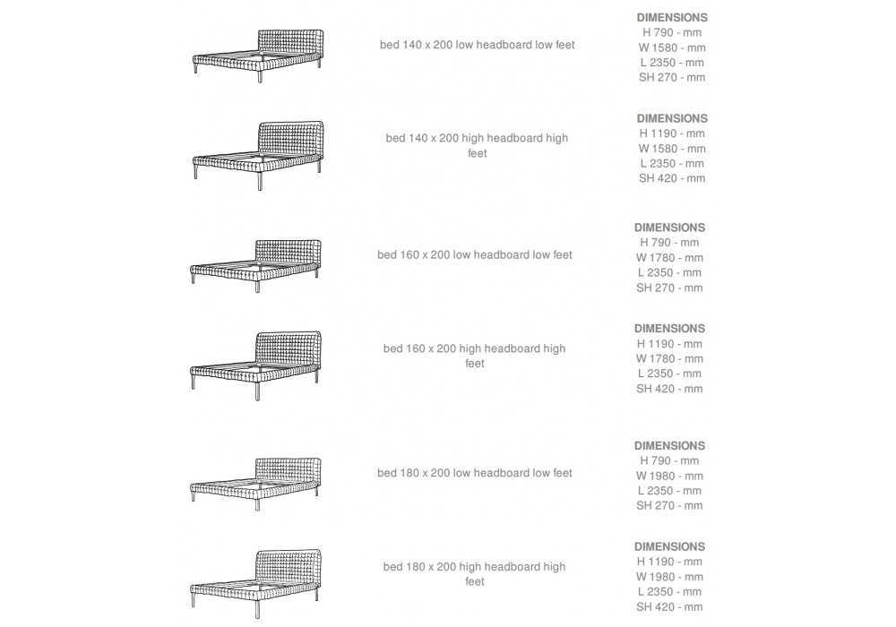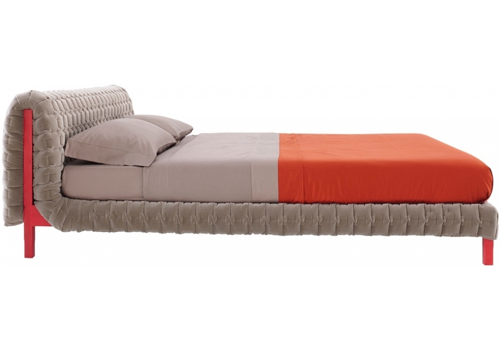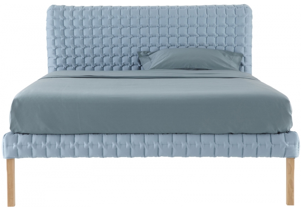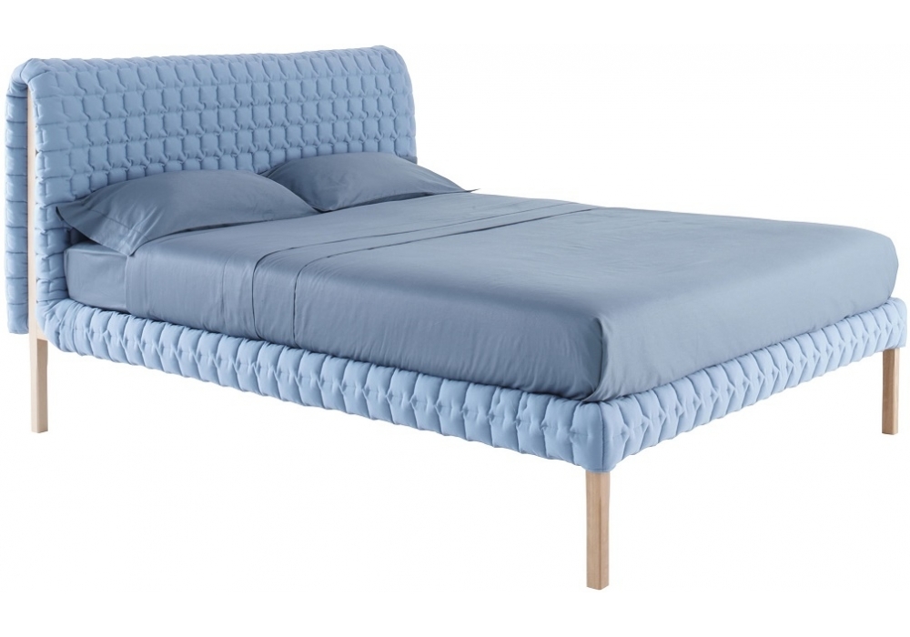 As with the Ruché settee, the Ruché bed, designed by Inga Sempé for Ligne Roset, is lifted from the ground by a simple, fine structure which supports a comfortable sleep platform. The headboard and frame are dressed with a distinctive quilting, a kind of boutis stitch of padding made using a cross-hatching of interrupted seams.