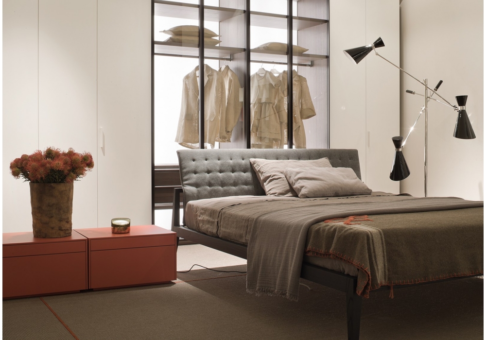 Theo designed by Studio Kairos for Lema is a bedwith a wood structure and the headboard is available in matt lacquer, wood or upholstered in fabric, leather or eco leather. Available in two widths.
