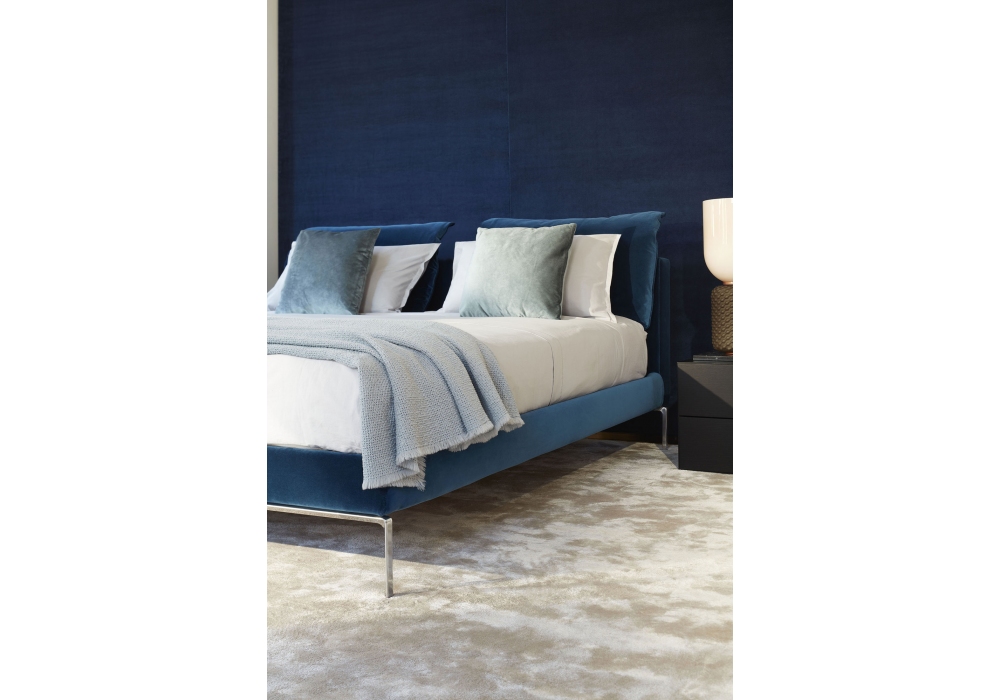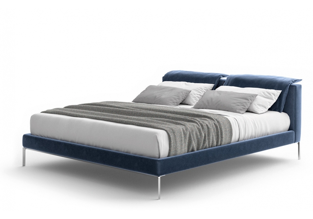 L32 Moov designed by Piero Lissoni for Cassina is a bed with upholstered headboard and bed frame. Cushioning to contain the pillows: this is held up against the top part of the headboard by a roller system. The legs are in die-cast polished aluminium.