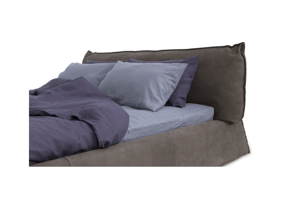 Paris Slim designed by Paola Navone for Baxter is a bed with leather upholstery. Bed surround in honeycomb pine and poplar wood. Padding in differentiated density polyurethane foam, with acrylic fibre covering. Feet in walnut-stained beech. Headboard with frame in drawn spring steel, elastic straps, washed and sterelized goose down padding with polyurethane foam insert in differentiated density. Leather upholstery with sharp edge stitching.