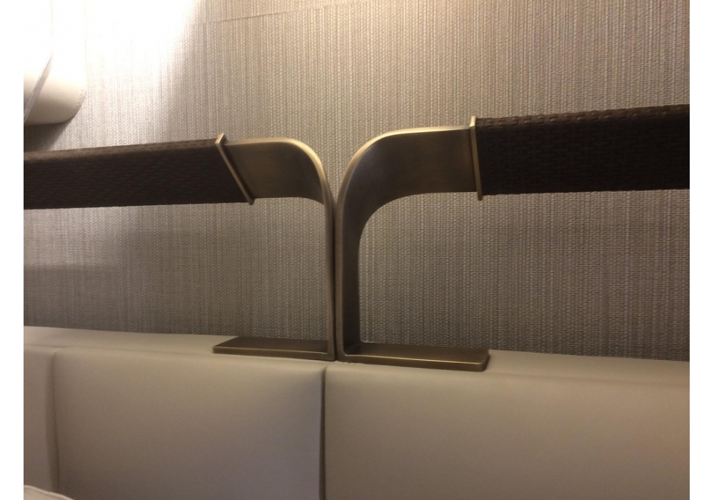 Grace designed by Rugiano is a beautiful bed with structure upholstered in fabric or leather. Also available in 3 different sizes. Bronze details. Slat, mattress, set cushions and sheets are not included in the price.