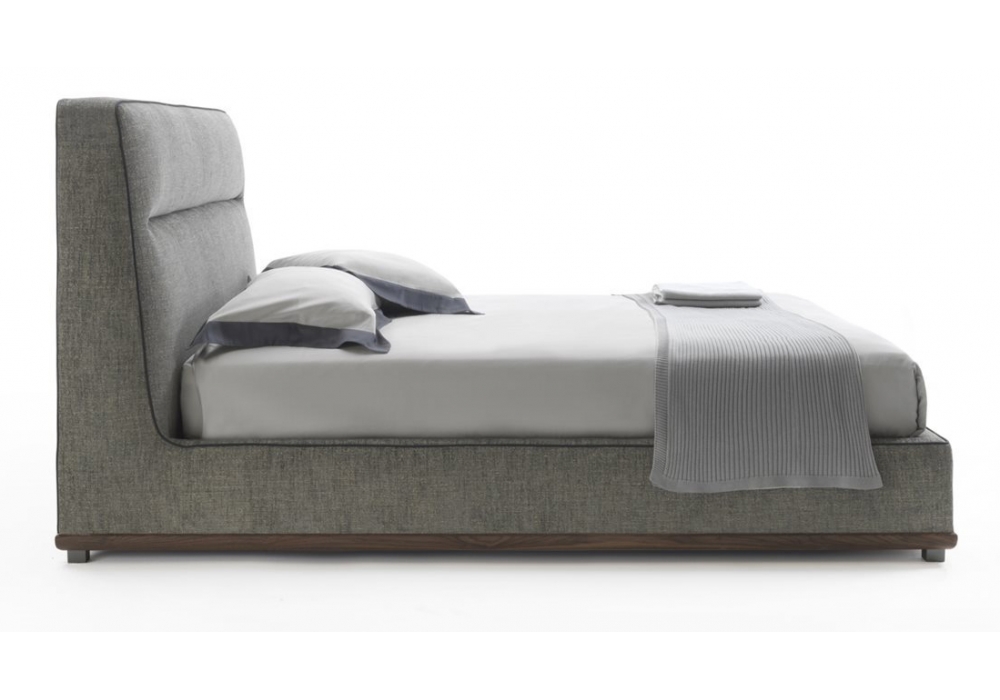 Kirk designed by Carlo Ballabio for Porada is a bed with beechwood slatted base base and lower frame in solid canaletta walnut. Structure in solid wood and plywood, foam-coated with high-density crushproof polyurethane. Feet in pewter gray metal. Upholstery available in leather or fabric. Mattress not included.