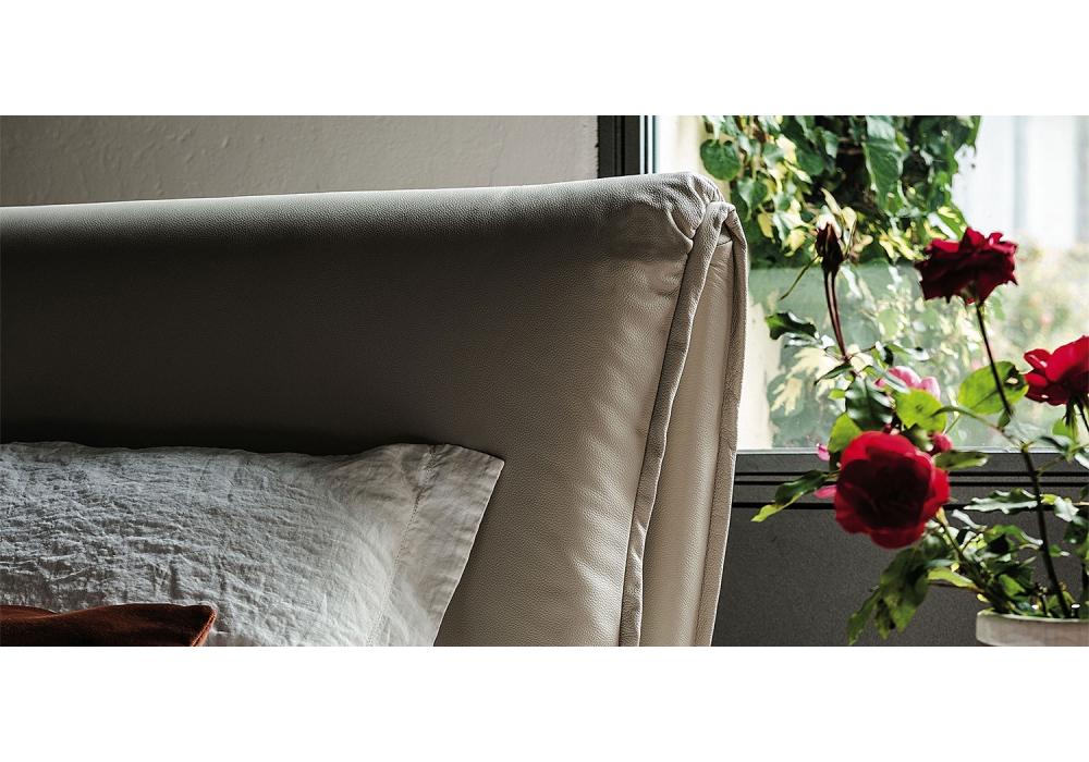 Adam designed by Gino Carollo for Cattelan Italia is a bed with feet in American walnut or oak, entirely covered in fabric, eco-leather or leather. Headboard profile in matching upholstery, in leather 989. Slatted base included, available in different dimensions.