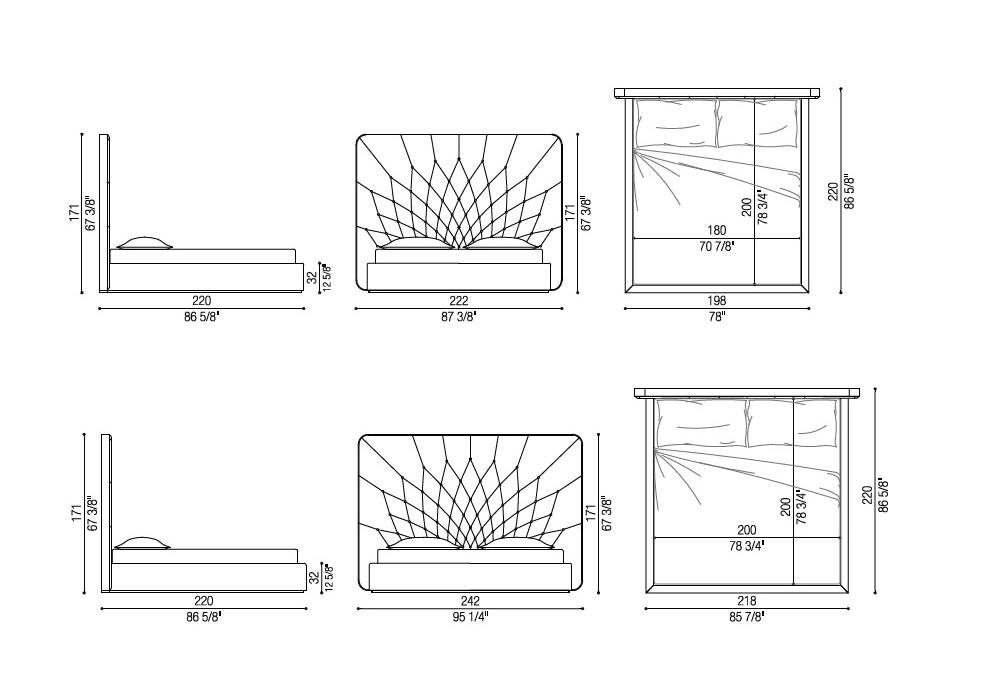 Vertigo designed by Castello Lagravinese Studio for Opera Contemporary is a bed with an elegant tufted headboard and metal frame that surrounds it, available in different finishes. Non-removable upholstery in fabric or leather. Base and mattress not included.