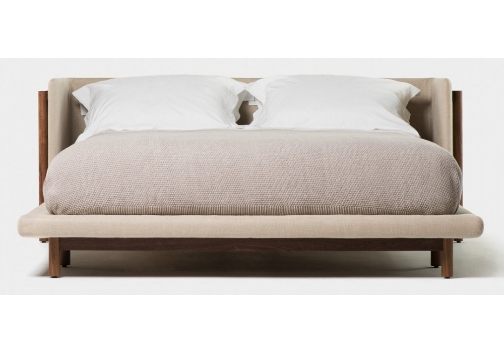 Frame designed by Neri & Hu for De La Espada is a bed with headboard and bedframe upholstered in fabric or leather and wooden structure available in different finishes. Also available in various dimensions and 2 versions: standard or headboard with armrests. Mattress not included!