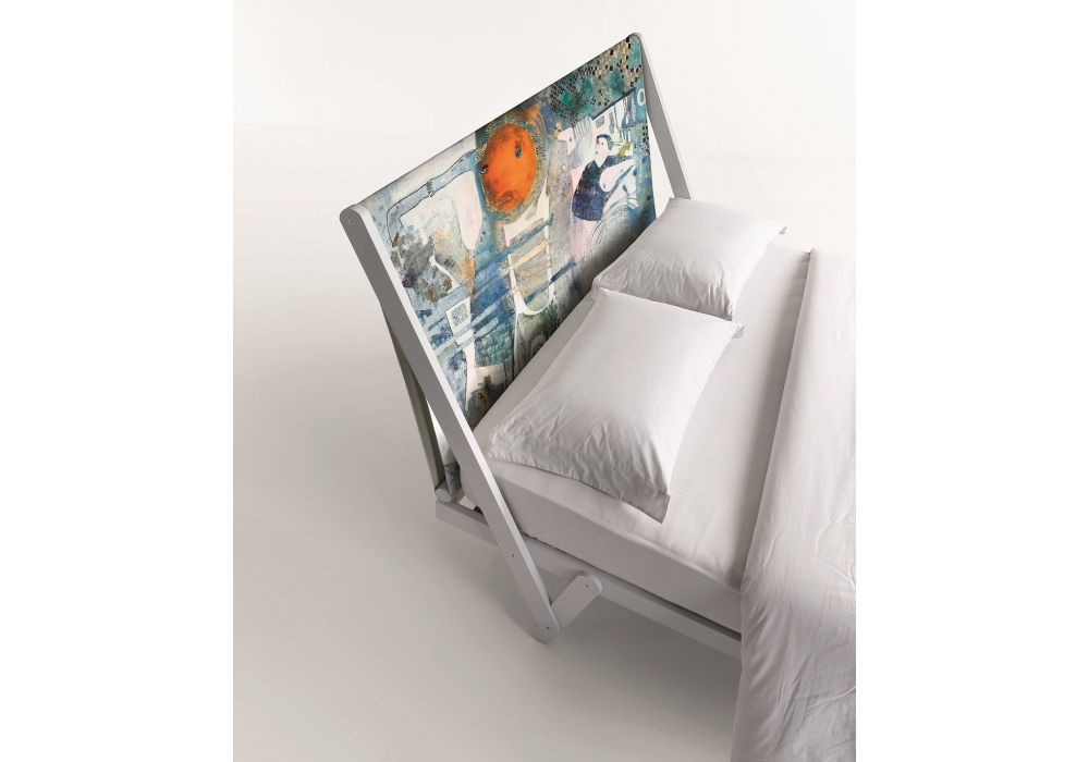 The Tolò bed, designed by Vittorio Prato for Noctis, is presented in a limited edition. The headboard reproduces the opera "Game with the sun" by the Italian naturalized German artist Gesine Arps. Available in a limited edition of 100 pieces, each of which is unique and unrepeatable. Each piece authenticated directly by Arps, has a progressive number from 1 to 100.