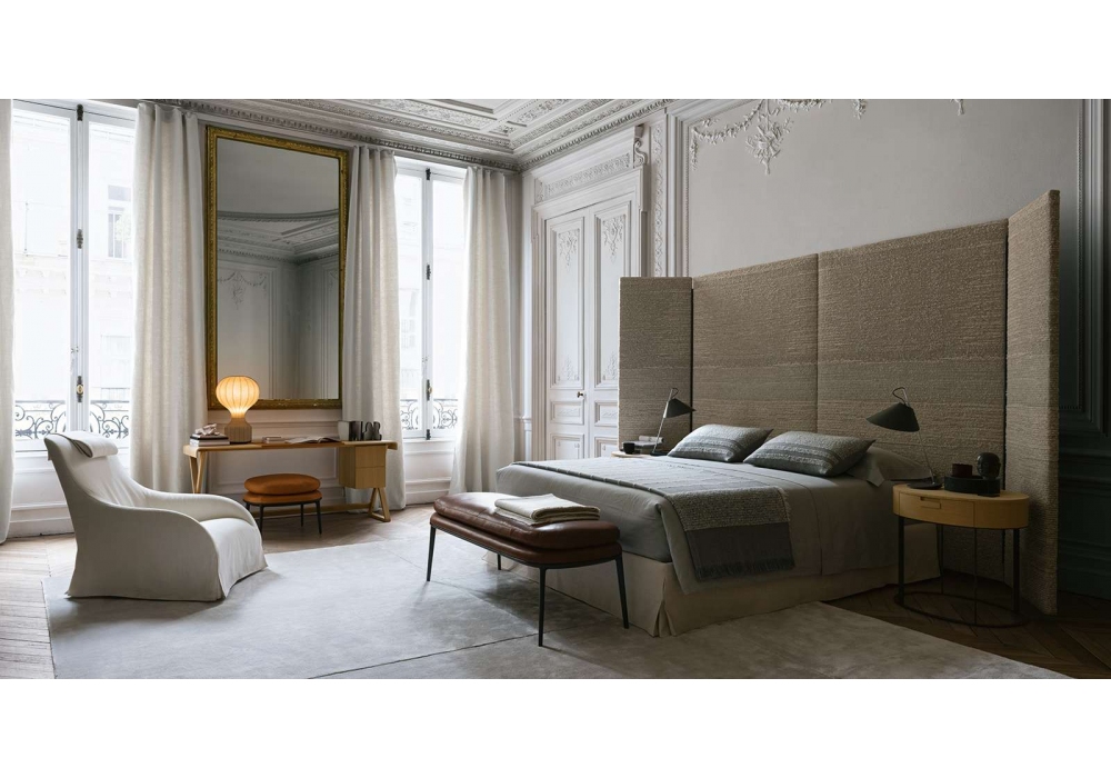 Dike designed by Antonio Citterio for Maxalto is a bed with bed frame covered in fabric, available in different finishes. Dike features also an upholstered headboard by generous size. The bed is available with 2 front feet and 2 wheels (located on the rear crossbar). Feet in black painted steel. Wheels in black plastic material. The cover is completely removable. Also available in different sizes.