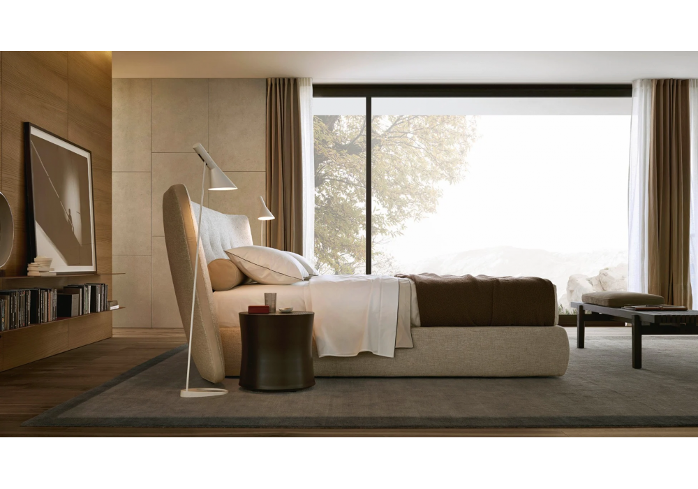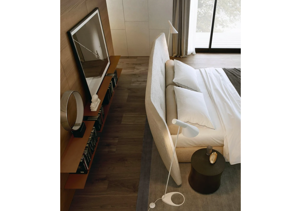 Rever designed by Rodolfo Dordoni for Poliform is a bed with fixed bedstead or lift-up bedstead. Upholstered bed frame with covering in leather or fabric. Upholstered headboard with covering in fabric, leather, or with lateral bands in leather.
