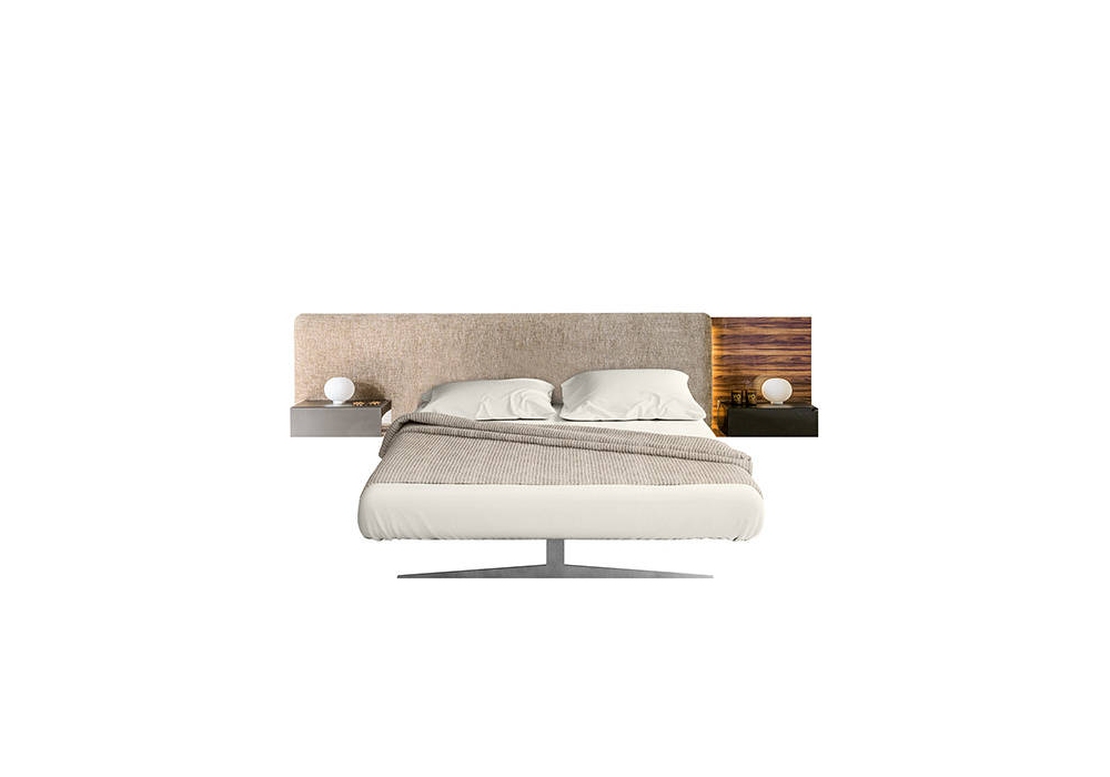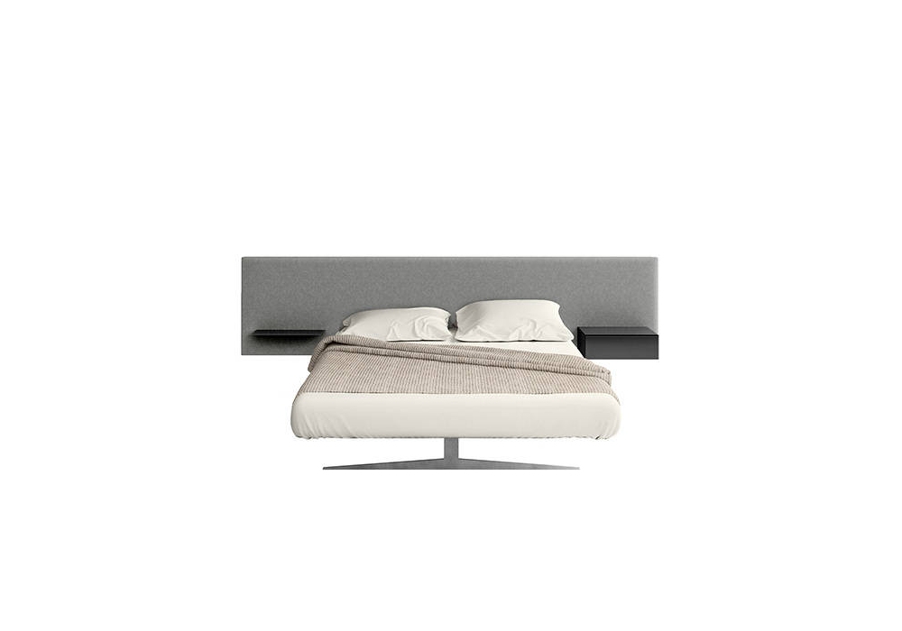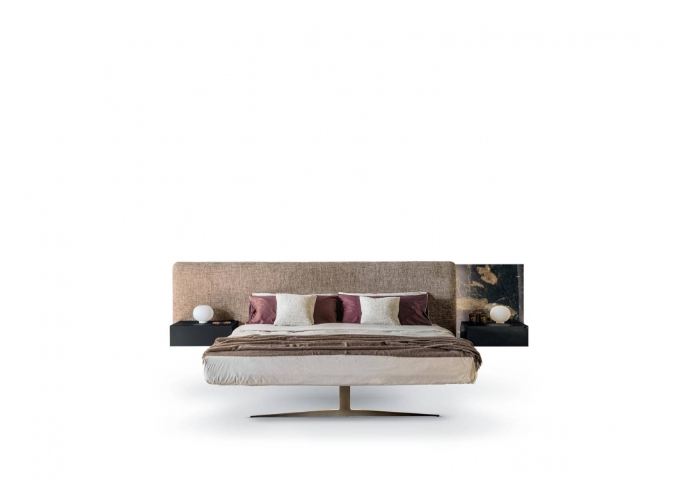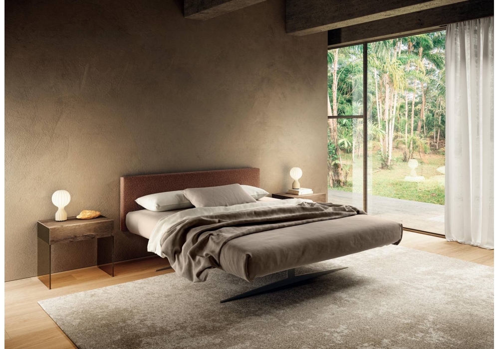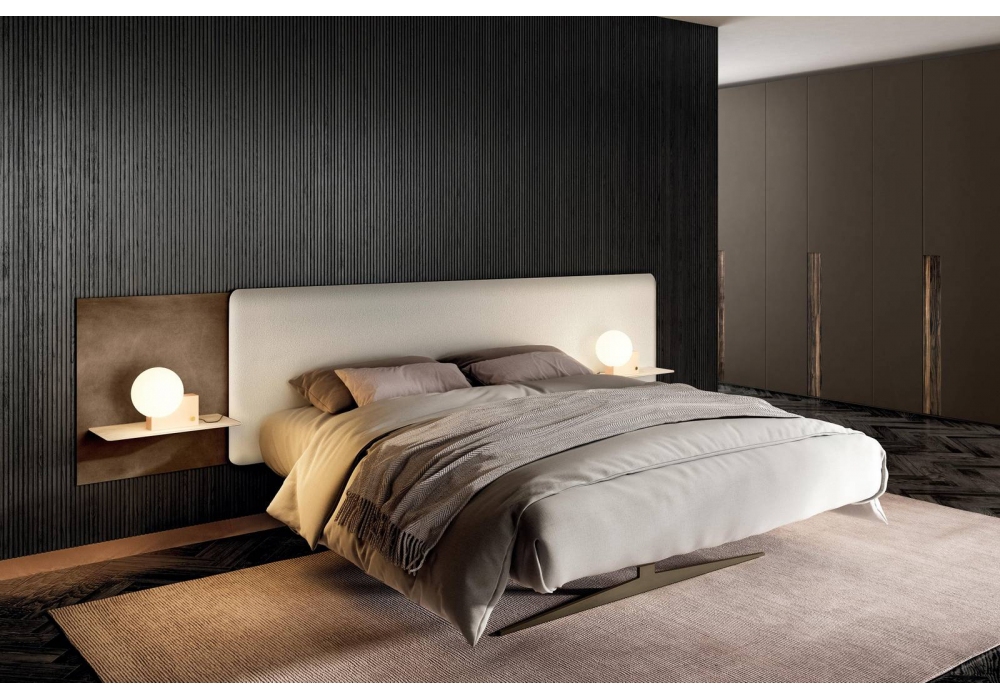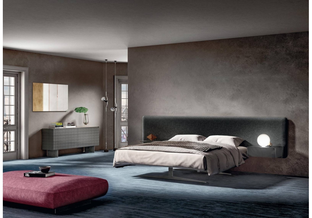 Steel designed by Daniele Lago is a bed with headboard covered in completely removable fabric or leather and steel legs. The bed is available with wall-mounted headrest or freestanding, so it can also be placed in the center of the room. It is available in different finishes and sizes.