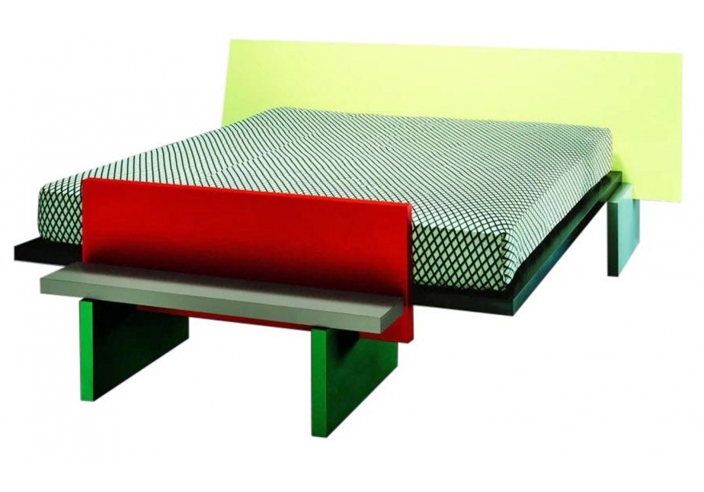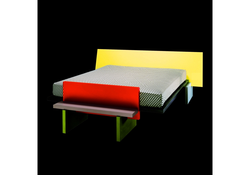 Horizon designed by Michele De Lucchi for Memphis Milano is a double bed with plastic laminate structure.
