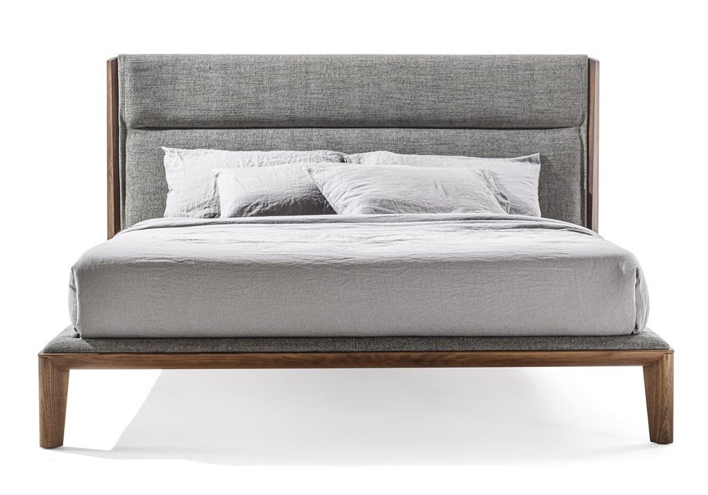 Nyan designed by Gabriele & Oscar Buratti for Porada is a bed with structure entirely made of solid canaletta walnut, net frame in poplar plywood, headboard with supporting structure in poplar plywood and padding in shaped polyurethane. Available in different dimensions. Upholstery in fabric or leather.