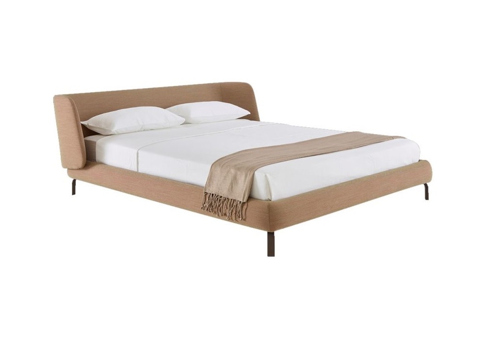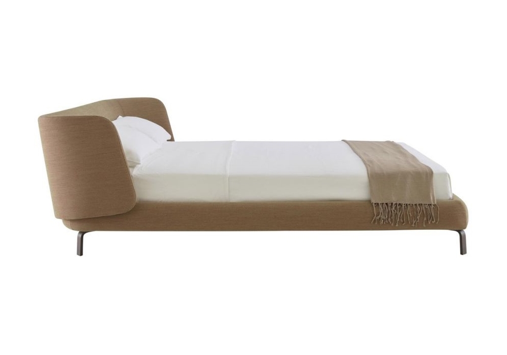 Desdemone designed by N. Nasrallah & C. Horner for Ligne Roset is a bed with structure in tubing and panels of multi-ply clad in polyurethane foam and polyester quilting. Headboard (high or low) in tubing and metal mesh clad in polyurethane foam and polyester quilting. Any type of slatted base may be used. Fabric upholstery. Available in different sizes.
