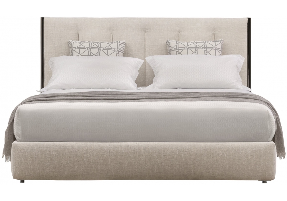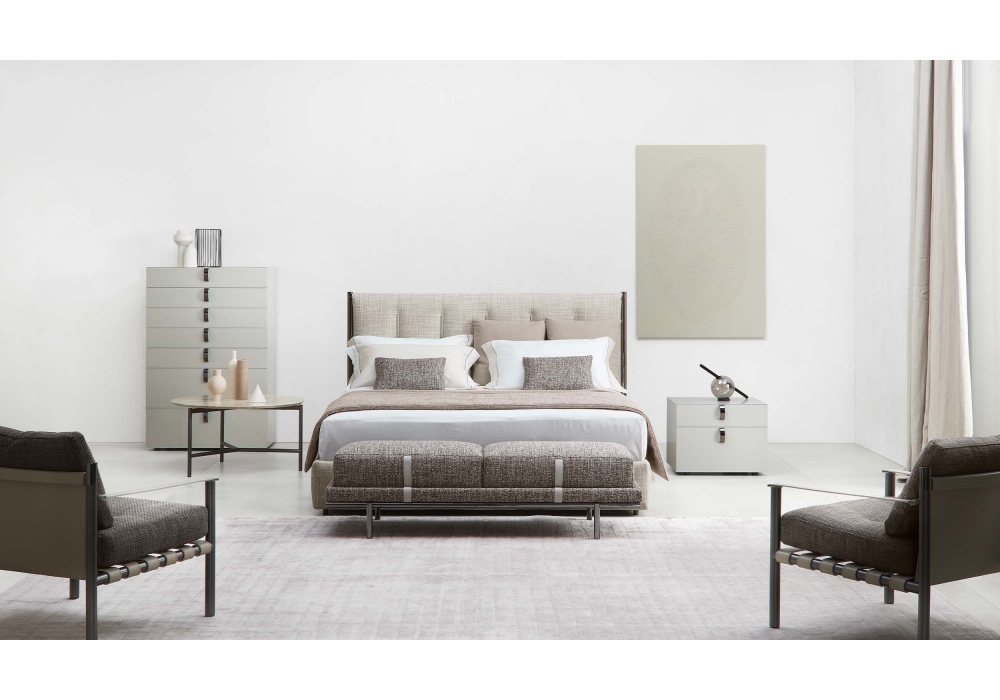 Koy designed by Carlo Colombo for Flou is a bed with upholstered base and headboard with fabric or leather covering. Metal structure that continues downwards to form the feet in glossy black nickel or matt burnished finish. Available with a slatted base, a storage base, a slatted base with electric movements, and the Leonardo base.