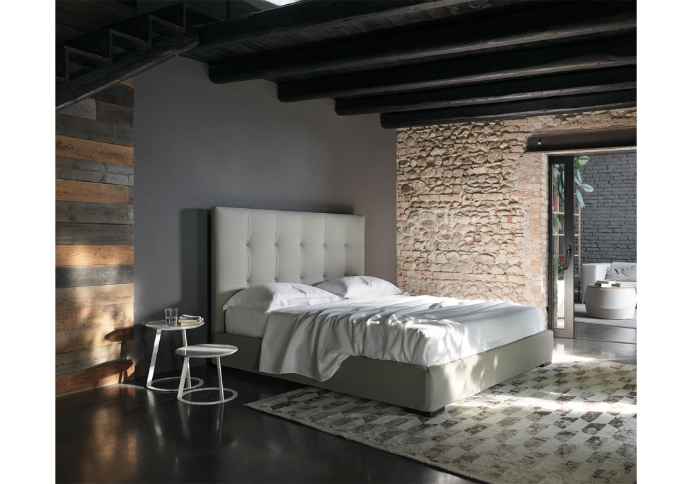 Grenada High designed by Renato Zamberlan for Casamania & Horm is a padded bed with removable upholstery in fabric, leather or faux-leather. Fixed slatted base, bed frame outside the mattress and feet in beech wood included in the price. Available in different dimensions.