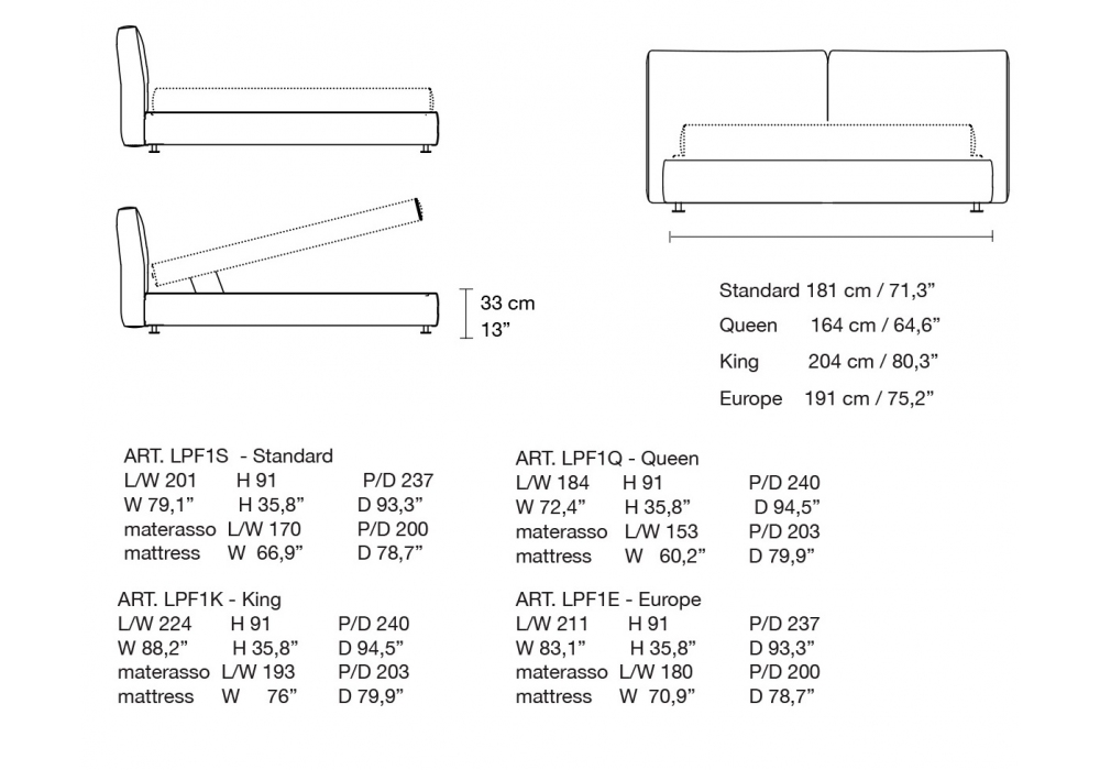Parsifal designed by Giuseppe Bavuso for Alivar is a bed made with a steel and wood headboard with differentiated density polyurethane foam padding and polyester fiber lining. Bed frame in fir plywood covered with polyurethane foam and coupled interliner. Feet in chromed steel and removable cover in leather or fabric. Base in birch plywood with curved slats with stiffness adjusters in the lumbar area. Bed base with electric movement on request. Also available in the version with container with liftable base.