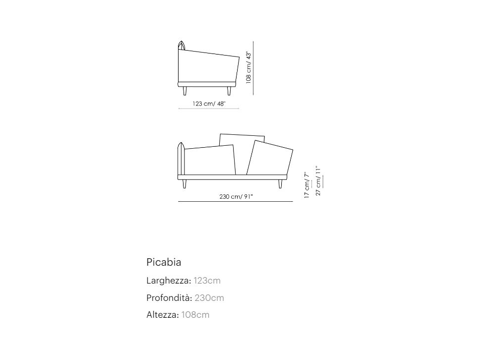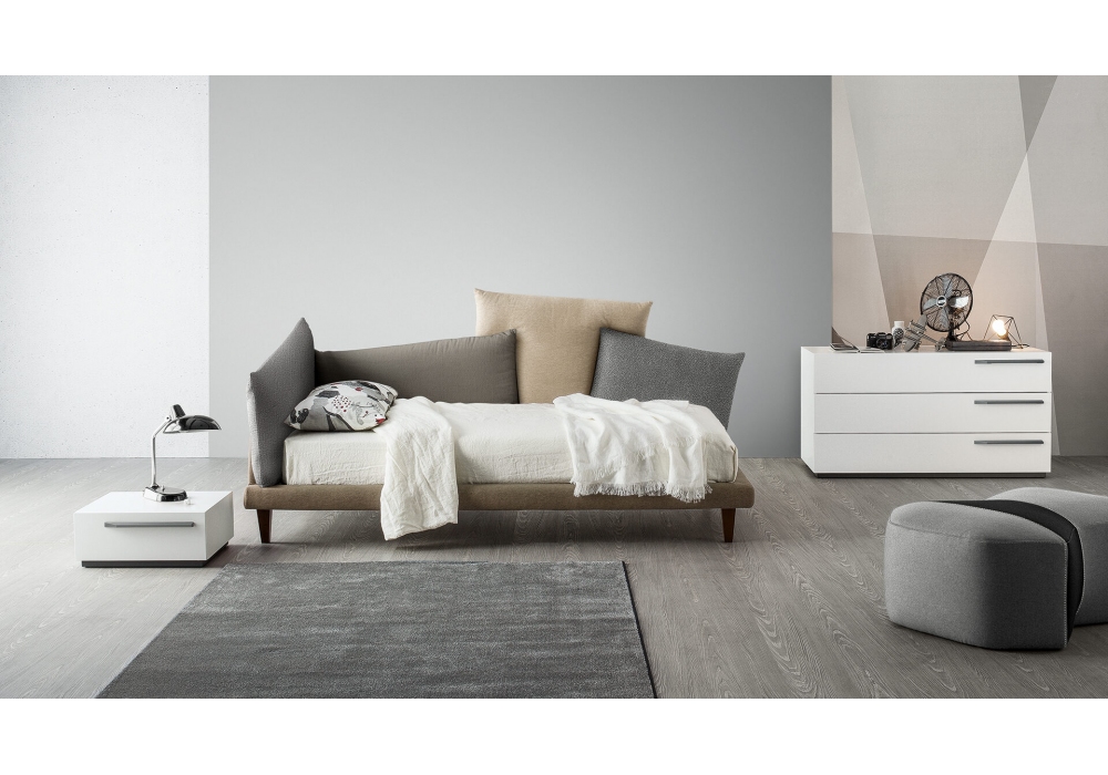 Picabia designed by Giuseppe Viganò for Bonaldo is a single bed with wooden structure and upholstery in leather or fabric. Available in different models. Feet in metal or matt painted wood. The cushions that make up the headboard can be monochromatic or with different shades of color: ask our Customer Service to configure the polychromatic headboard.