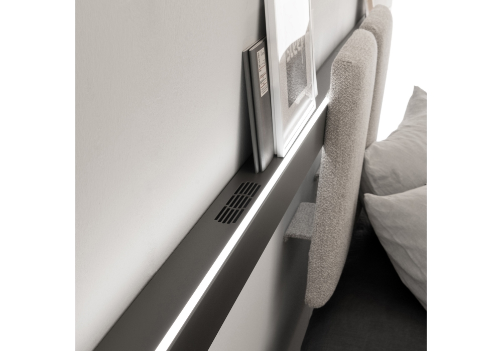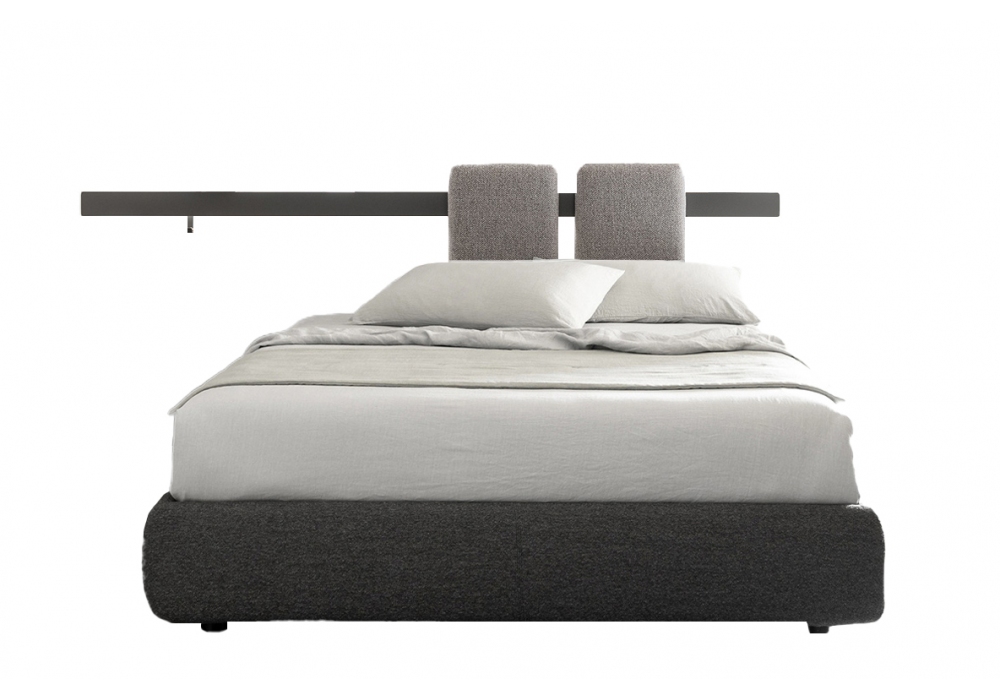 Groove designed by Monica Graffeo for Caccaro is a box bed with or without upholstered container, the headboard has sliding, padded and removable cushions. Available in various sizes and finishes. Mattress not included.